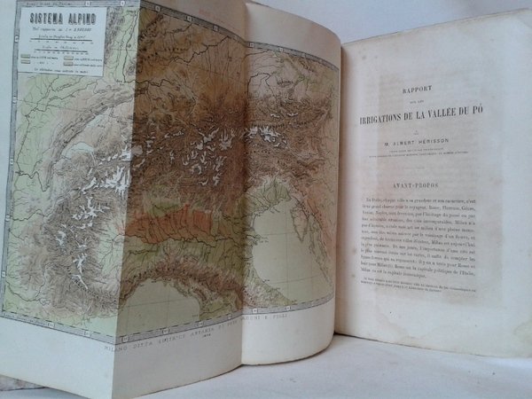 Volume in 8 grande cartonato alla bodoniana, sguardie, occhiello, frontespizio, carta corografica a colori, 219 pp., 21 tavole pi volte ripiegate, due ulteriori tavole al fondo del volume, illustrazioni nel testo. Trattato davvero esauriente sui sistemi e le tecniche d'irrigazione nella valle del Po con un'attenta analisi delle opere idrauliche e di distribuzione delle acque nonch dei metodi di sfruttamento delle risorse idriche. Notevole, in bello stato, piccoli restauri ai margini delle prime carte, qualche sparsa e non inficiante fioritura.