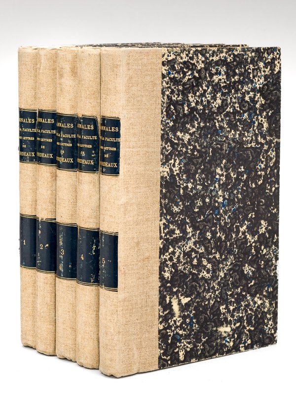 5 vol. in-8 reliure uniforme demi-toile grise, Librairie H. Duthu, Bordeaux, H. Delaroque, Paris, S. Calvary, Friedlander et Sohn, Berlin, Barthès et Lowell, Londres, Le Soudier, Paris, Librairie Centrale, Toulouse, 1879-1883, 2 ff., 392 pp. avec une planche dépliante ; 2 ff., 418 pp. ; 2 ff., 486 pp. ; 2 ff., 482 pp. ; 2 ff., 397 pp. e 1 f. Rappel du titre complet : Annales de la Faculté des Lettres de Bordeaux (5 premières années : 1879-1883) Tome I Première Année : 1879 ; Tome II Deuxième Année : 1880 ; Tome III Troisième Année : 1881 ; Tome IV Quatrième Année : 1882 ; Tome V Cinquième Année : 1883 Rare tête de série réunissant les 5 premières années des "Annales de la Faculté des Lettres de Bordeaux". Parmi les nombreux articles : Raymond Céleste : "Louis Machon, apologiste de Machiavel et de la politique du cardinal de Richelieu" ; Fonsegrive : "Le dilemme de Lequier" ; Duméril : "Appolonius de Tyane" ; Michel Bréal : "Praevaricator" ; F. Combes : "Montaigne et La Boétie" ; A. Luchaire : "Une théorie récente sur l'origine des Etats Généraux" ; E. Denos : "Les origines de la féodalité en Bohème" ; Flourac : "Une charte béarnaise de 1277" ; Couat : "Les poèmes astronomiques d'Aratus" ; Luchaire : "Une Charte aragonaise de 1025" ; Vinson : "Un texte basque Bas-Navarrais de 1571" ; C. Henry : "Notes sur divers points d'histoire des mathématiques grecques" ; M. Bréal : "Etymologie du mot indutiae" ; Foncin : "La Cité de Carcassonne, ses monuments et son histoire, du Ve au VIIIe siècle" ; A. Luchaire : "Sur les origines de Bordeaux", etc. etc. Bon ensemble (dos lég. frottés avec petites usures en pièces de titre, bons exemplaires par ailleurs)