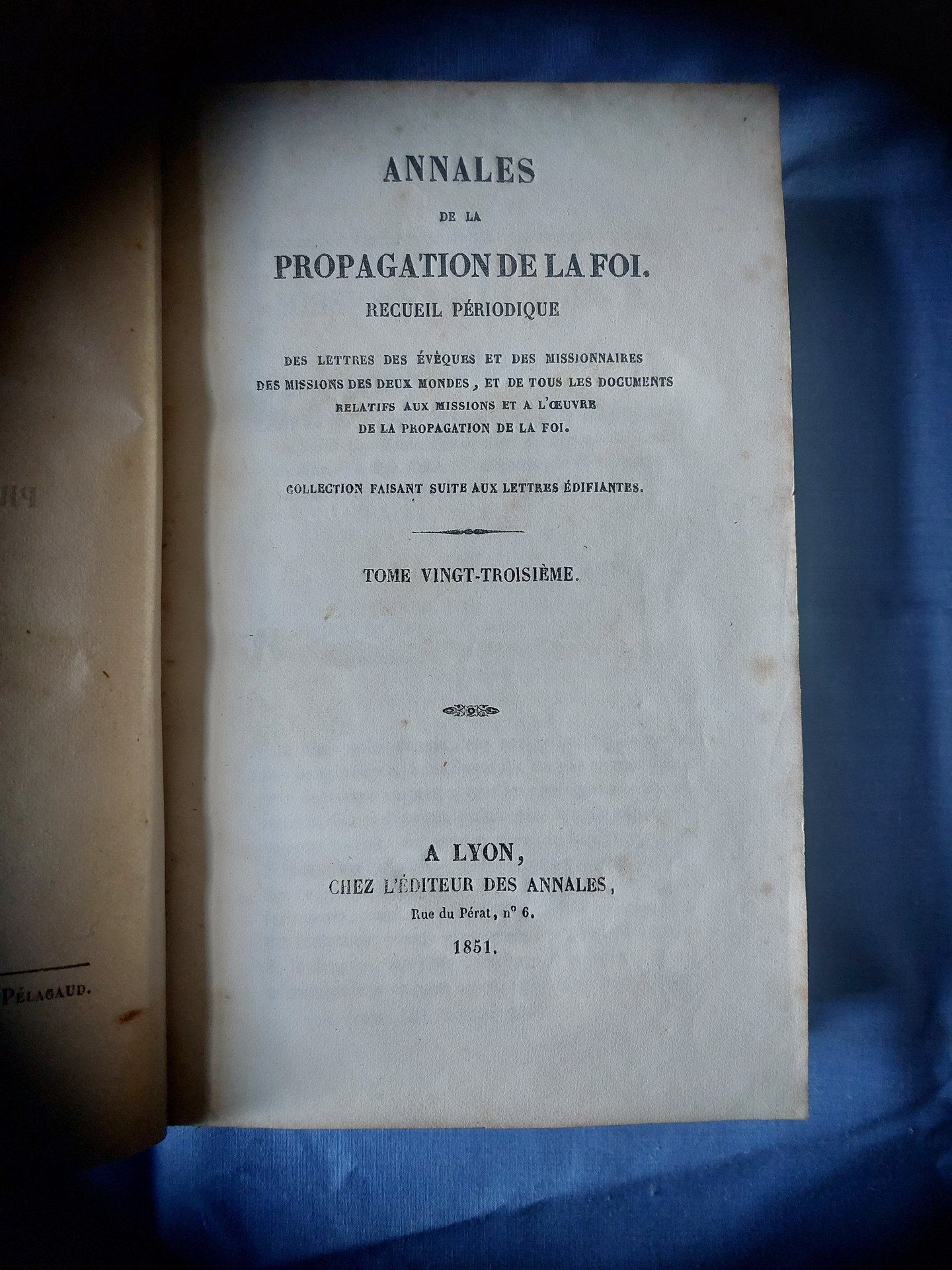 488 & 492 pp. T. 23 & 24, 1851 - 1852. "Recueil périodique des lettres des Evêques et des Missionnaires des Missions des deux mondes, et de tous les documents relatifs aux Missions et à l'Oeuvre de la propagation de la Foi". Indépendamment de l'objectivité admirable observation des peuples évangélisés en Afrique, en Asie ou encore en Amérique et en Océanie. On y trouve des "articles" comme : "Equipage d'une chaloupe française mangé par les Calédoniens" ou "Cuisine à la vapeur"