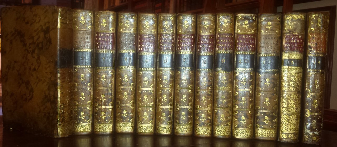In-8 (19,5 cm) 14 voll. (su 18) 512; 512; 512; 512; 512; 512; 512; 512; 512; (2) 475 (13); 516; 569; 536; 516. Marca editoriale al frontespizio. Occhietto col titolo"Annales politiques, civiles et litteraires". Piena pelle, marocchino marezzato con caratteri e fregi dorati al dorso.Contropiatti rivestiti di carta marmorizzata; qualche margine annerito del nono e dodicesimo volume, fori ai margini delle ultime carte del quattordicesimo volume con perdita di testo dell'ultimo argomento dell'ultima carta dell'indice delle materie. Gli Annali politici, civili e letterari del Settecento è una rivista creata nel 1777. Scritti da molti autori, tra cui Linguet, ma anche d'Alembert, Nicolas Baudeau e Voltaire, gli Annales politiques apparvero dal 1777 al 1792. Linguet attaccò violentemente la monarchia negli anni 1780 e successivi. Nel settembre 1788, il numero 116 di questo giornale fu bruciato per ordine del Parlamento di Parigi. A quel tempo Linguet pubblicava articoli in onore dell'imperatore Giuseppe II d'Austria e Giorgio III del Regno Unito, al fine di ottenere fondi da loro. Questi articoli mandarono Linguet alla ghigliottina nel 1794. French language. Lingua francese