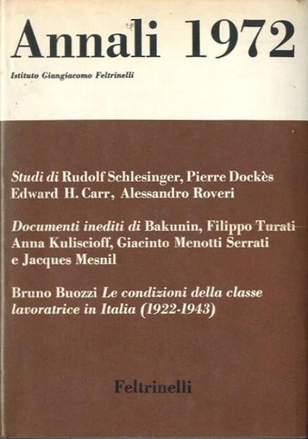 476 p. ; 26 x 17 cm. Questo numero degli «Annali» presenta una rassegna di studi di Rudolf Schlesinger, Pierre Dockès, Edward H. Carr, Alessandro Roveri. Inoltre una raccolta di documenti inediti di Bakunin, Filippo Turati, Anna Kuliscioff, Giacinto Menotti Serrati e Jacques Mesnil. Infine il saggio di Bruno Bozzi "Le condizioni della classe lavoratrice in Italia (1922-1943). Legatura editoriale, coperta in cartone rigido di colore marrone, con sovraccoperta colorata (b/n e marrone) con alette. Firma di appartenenza nel front. con data (1974), per il resto buon esemplare. . Codice libreria 2453.