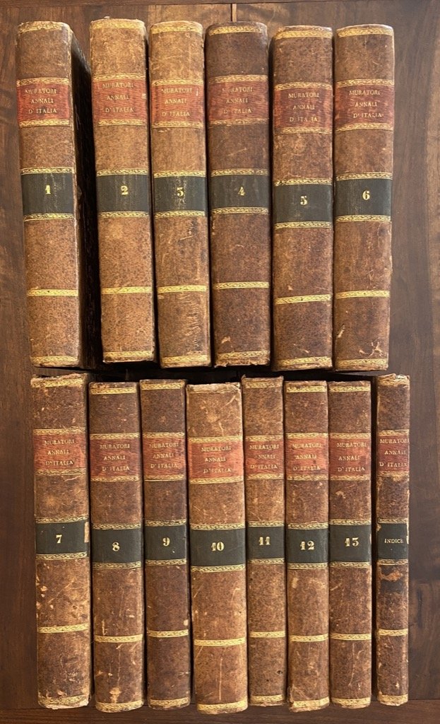 Quattordici volumi in quarto, cm 27 x 20, legati in mezza pelle con titoli dorati su tasselli rossi e neri, tagli spruzzati azzurri. Opera completa dei 12 volumi degli Annali, il tredicesimo di continuazione (1750-1764) e il tomo di indici. Tomo primo, 1762: Dall'Anno primo dell'Era volgare fino all'Anno 211, pp (4) 38 (2) 501 (1), ritratto inciso all'antiporta, incisione di medaglia nel testo della prefazione, frontespizio rubricato; piccolo difetto sull'occhietto e sull'ultima carta. Tomo secondo, 1762: Dall'Anno 222 dell'Era volgare fino all'Anno 400, pp XV (1) 526 (2). Tomo terzo, 1762: Dall'Anno 401 dell'Era Volgare fino all'Anno 600, pp XXIV 510 (2). Tomo quarto, 1762: Dall'Anno 601 dell'Era Volgare fino all'Anno 840, pp XXXIX (1) 532. Tomo quinto, 1763: Dall'Anno 841 dell'Era Volgare fino all'Anno 1000, pp LXVIII 482 (2). Tomo sesto, 1763: Dall'Anno 1001 dell'Era Volgare fino all'Anno 1170, pp L 520. Tomo settimo, 1763: Dall'Anno 1171 dell'Era Volgare fino all'Anno 1300, pp LXXXVIII 452. Tomo ottavo, 1763: Dall'Anno 1301 dell'Era Volgare fino all'Anno 1400, pp LXXV (1) 452 (2). Tomo nono, 1763: Dall'Anno 1401 dell'Era Volgare fino all'Anno 1500, pp LXXI (1) 348. Tomo decimo, 1764: Dall'Anno 1501 dell'Era Volgare fino all'Anno 1600, pp (8) LXXVIII (2) 475 (1). Tomo undecimo, 1764: Dall'Anno 1601 dell'Era Volgare fino all'Anno 1700, pp (4) XL 358 (2). Tomo duodecimo, 1764: Dall'Anno 1701 dell'Era Volgare fino all'Anno 1750, pp (4) LIX (1) 380. Tomo [tredicesimo] «continuati da .», 1770: Dall'Anno MDCCL fino all'anno MDCCLXIV, pp (4) 380. Tomo [quattordicesimo], 1770: INDICE GENERALE DELLE COSE NOTABILI CONTENUTE NE' XII TOMI DEGLI ANNALI D'ITALIA [.] E NEL TOMO XIII DELLA CONTINUAZIONE DI DETTI ANNALI, pp (2) 274. Vignette sui frontespizi, testatine e finalini incisi. In calce al quinto tomo una carta con DETTAGLIO DEI LIBRI Che in maggiore numero si trovano appresso Giovanni Riccomini Stampatore, e Librajo in Lucca con li rispettivi prezzi. Sulle sguardie anteriori di alcuni volumi antica firma di proprietà. Discreto stato di conservazione nel complesso, con qualche segno del tempo: carte brunite (specie i tomi 10 e 11), gore e aloni sui margini, qualche raro lavoro di tarlo contenuto ai soli margini interni; lievi difetti sui dorsi di qualche tomo. Il canonico Giuseppe Catalani (Paola 1698 - Roma 1764) curò a più riprese l'edizione degli Annali muratoriani, apparsa inizialmente in 24 volumi in ottavo editi a Roma nel 1752-1754, con l'aggiunta di estese prefazioni e della cronaca ulteriore. Questa edizione lucchese, di formato maggiore, contiene inoltre in ciascun tomo dediche degli editori a notabili del tempo. Sorbelli, II, p. 47; Brunet, III, 1950; Graesse, IV, 626 - 627.