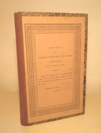 Firenze, presso Leonardo Marchini, TREDICESIMO TOMO. Mz tela, ai piatti carta editoriale con indicazione del tomo e dei fogli di stampa entro cornice decorativa, in 8°, pp. 366. Su carta forte. Ampi margini, testo pulito. Fioriture alle ultime 20 pagine. Ben conservato.