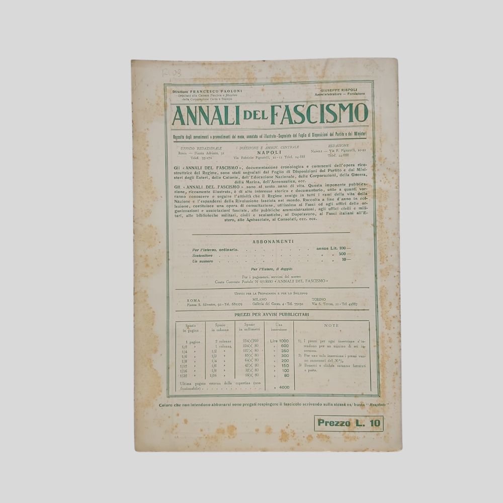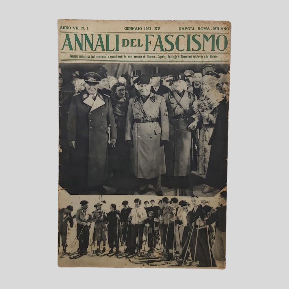 Anno VII, n. 1 gennaio. Anno VII. In-8 (cm 21), pp. 107, con illustrazioni intercalate in bianco e nero. Tracce d’uso e qualche insignificante fioritura. La vita del P.N.F., Nazione Militare e Forze Armate, Educazione della Gioventù, Rapporti internazionali, Colonizzazione imperiale dell’Africa italiana, Economia, Finanza, Demografia, movimento sindacale, ordinamento corporativo, Il Regime per il popolo, Opere del Regime, Scienza Cultura, Arte, Tecnica, Pagine di Storia, Recensioni librarie. Con numerose inserzioni pubblicitarie.