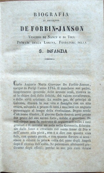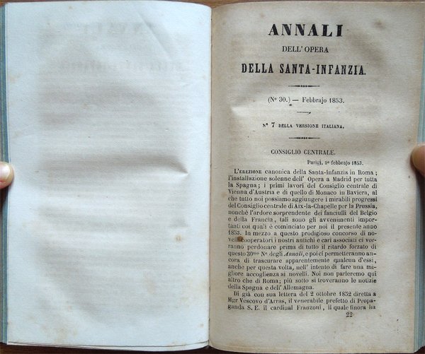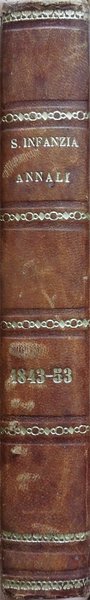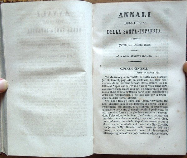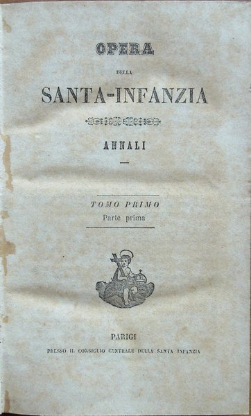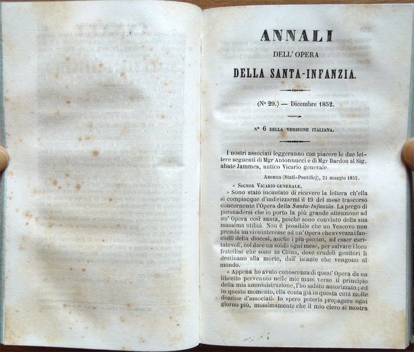 Sei fascicoli in un tomo in-16° (17,3 x 10,5 cm), pp. 141, (3), 269-380, legatura coeva in mezza pelle, con titoli e dentelles in oro al dorso. Lievi, normali segni del tempo alla legatura. Tagli decorati a spruzzo. Normale patina del tempo alle pagine, con alcuni piccoli, lievi segni d'umido e con arrossature dovute al tipo di carta. Per il resto, ben conservato. Oltre al Tomo primo, Parte prima, degli Annali, pubblicato, in Italia, nel 1859, il volume raccoglie i fascicoli della versione italiana che vanno dal al numero 5 al numero 9. Dettaglio: 1) Tomo primo - Parte prima, stampato a Oneglia, presso la Stamperia G. B. Tasso nel penitenziario, nel 1859. Biografia di Monsignor De Forbin-Janson, Vescovo di Nancy e di Toul, Primate della Lorena, Fondatore della S. Infanzia. Cenni intorno all'origine ed ai progressi dell'Opera della Santa Infanzia. Consiglio centrale di Parigi. I. Dicembre 1845. II. Ottobre 1846. III. Aprile 1847. IV. Relazione sopra lo stato dei bambini in Cina e sopra l'Opera della S. Infanzia letta al Consiglio centrale nella seduta del nove febbraio 1847 dal signor Gabet, missionario apostolico e provicario di Mongolia. V. Dicembre 1847. Messe annuali dell'Opera. VI. Oblazioni fatte all'Opera. Corrispondenza d'Europa. Francia. Belgio. Germania. America. Corrispondenza di Cina. 2) (N. 28) - Ottobre 1852, n. 5 della versione italiana. Consiglio centrale. Mandamenti e lettere pastorali dei NN. Mgri vescovi. Corrispondenza d'Europa. Francia. Estero. Belgio. Allemagna. Napoli. Oltremare. Canada. Corrispondenza di China. 3) (N. 29) - Dicembre 1852, n. 6 della versione italiana. Marcia e progresso dell'Opera. Corrispondenza d'Europa. Francia. Estero. Belgio. Corrispondenza di China. 4) (N. 30) - Febbraio 1853, n. 7 della versione italiana. Consiglio centrale. Corrispondenza d'Europa. Francia. Estero. Spagna. La Santa-Infanzia in Ispagna. Allemagna Corrispondenza di China. 5) (N. 32-33) - Giugno-Agosto 1853 della versione francese, n. 8 della versione italiana, (Marzo 1854). Consiglio centrale. Opera della Santa Infanzia. Rendiconto generale dell'esercizio dal 1° maggio 1852 al 1° maggio 1853. Corrispondenza d'Europa. Solenne battesimo d'un giovane siamese nella chiesa di San Sulpizio. Francia. Estero. Belgio. Germania. Stabilimento e progressi dell'opera della Santa Infanzia nel Regno Sardo. Genova. Novara. Africa. Algeria. Corrispondenza di Cina. Necrologia. 6) (N. 34-35) - Ottobre-Dicembre 1853 della versione francese, n. 9 della versione italiana, (Marzo 1854). Consiglio centrale. Corrispondenza d'Europa. Francia. Estero. Italia. Stati della Chiesa. Ancona. Regno di Napoli. napoli. Avellino. Stati Sardi. Genova. Valloire, Chamouny, Crest-Volland, Houches, Nizza, Megeva [solo nominate]. Diocesi di Albenga e Ventimiglia [solo nominata]. America settentrionale. Olanda. Asia. Manipoli di Ruth. Corrispondenza di Cina.