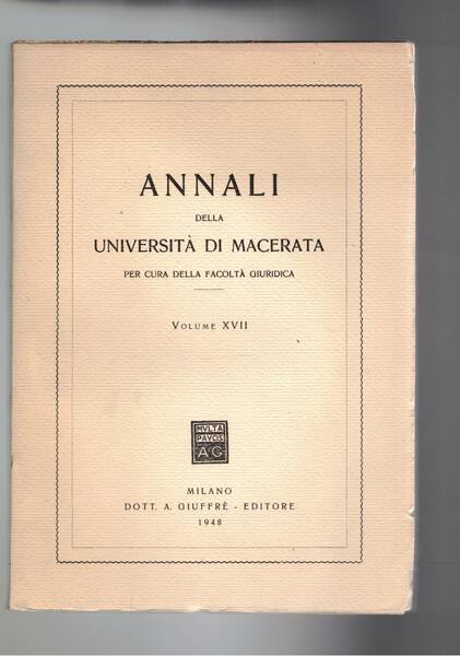 Annali della Università di Macerata, facoltà giuridica Vol. XVII 1948. L'università di Macerata nel periodo delle origini; l'autonomia scientifica del dititto ecclesiastico; gli aspetti essenziali della legge; ecc.