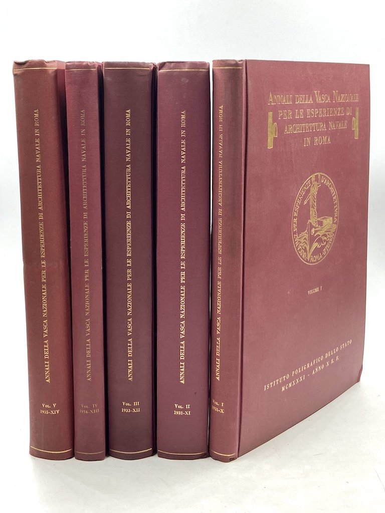 Primi cinque volumi della serie (che ci risulta interrotta col decimo pubblicato nel 1941), ciascuno in tutta tela rigida editoriale con titoli e stemma della Vasca impressi in oro , cm 27x20. Il primo volume (1931) si compone di pp (8) 99 (1) e XLVI tavole e tabelle ripiegate; contiene una prefazione del presidente dell’istituzione Giuseppe Rota e una sezione introduttiva che rende conto della costituzione e amministrazione della Vasca, delle opere murarie e idrauliche, del laboratorio per la preparazione dei modelli ecc, oltre ai decreti istitutivi e al tre relazioni di esperienze (rimorchio di carena, efficienza di eliche, autopropulsione). Il volume secondo (1932) conta pp X 51 (1) e LXII tavole e tabelle più volte ripiegate, contiene informazioni d’esercizio, tabelle dei costi, resoconti di esperienze. Il volume terzo (1933) conta pp VIII 139 (3) e XXXIII tavole e tabelle più volte ripiegate, contiene informazioni di esercizio e resocontò dei miglioramenti del laboratorio, resoconti di esperienze, e atti della Prima Riunione degli Ingegneri Aderenti agli Annali della Vasca Nazionale, con una decina di interventi relativi per lo più alla stabilità delle navi. Il volume quarto (1934) conta pp VIII 101 (1) e XXXI tavole e tabelle doppie o ripiegate, contiene i resoconti di esperienze, i decreti e tariffari, e le memorie presentate alla Seconda Riunione degli Ingegneri aderenti. Il volume quinto (1935) racchiude semi-tomi nella stessa copertina-custodia, uno col testo di pp (6) 95 (1) illustrate in nero, e uno composto da XXXVII tavole ripiegate. Raro insieme seppur non completo di questa non comune pubblicazione scientifica italiana.
