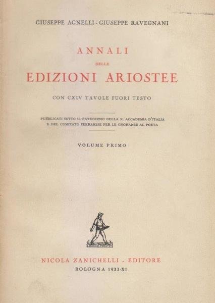 8°, br., 2 voll, pp.xxii-(2)-301-(3), (2)-396-(2), antiporta illustrata e moltissime tavole fuori testo. La più importante bibliografia sull'Ariosto. Ben conservato.