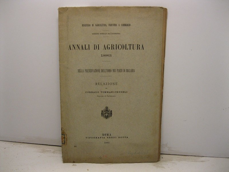 In 8, pp. 26 + (2b). Br. ed. Saggio sulle modalita' di preservazione dalla malaria. Corrado Tommasi-Crudeli (Pieve Santo Stefano, 1834 - Roma, 1900), dopo la laurea in medicina si reco' dapprima presso la scuola francese e successivamente in Germania per dedicarsi all'interpretazione cellulare della Patologia secondo i dettami della scuola di Rudolf Virchow. Fu quindi tra i fondatori dell'istopatologia italiana ma anche dell'Igiene e della profilassi. Oltre ai contributi scientifici immortalati in una settantina di pubblicazioni prevalentemente dedicate a malattie infettive socialmente rilevanti come la malaria, il colera, la difterite e la sifilide ed ai metodi per contenerne la diffusivita', egli trasferi' nelle aule parlamentari, prima come deputato e poi senatore, le intuizioni scientifiche che pose a fondamento di numerosi provvedimenti tra i quali la riforma sanitaria del 1888.