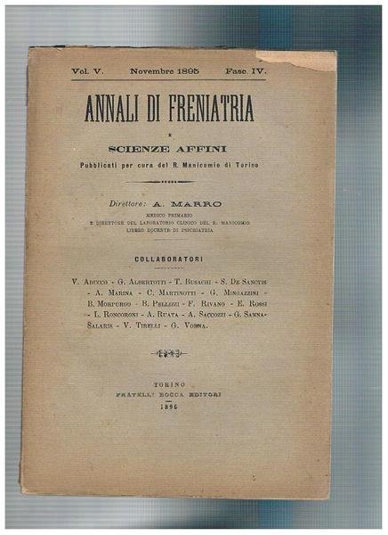Annali di Freniatria e scienze affini, pubblicato per cura del R. manicomio di Torino. Fasc. 4° ott. 1895. sull'azione fisiologica dei prodotti bacterici del maiz guasto di Vitige Tirelli; sul grado di responsabilità di un omicida perizia dei dr. Marro, Toselli, Voena; ecc.