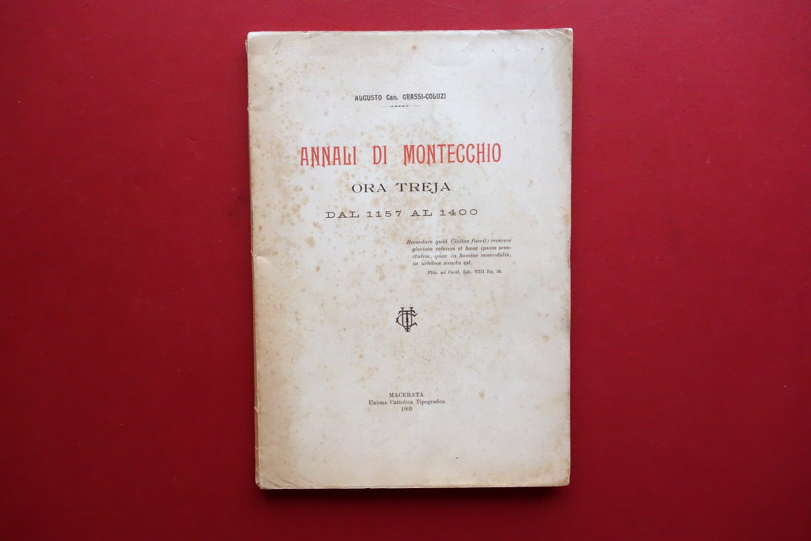 Augusto Can. Grassi-Coluzi, Annali di Montecchio ora Treja dal 1157 al 1400 Unione Cattolica Tipografica, Macerata 1905; cm 24x16,5; pp. 126-[2]; brossura ed. Condizioni di conservazione Buone condizioni con tracce d'uso, leggero foxing in particolare alla brossura e alle pagine iniziali e finali; cuffie con minuscole mancanze. Esemplare saldo e compatto, con pagine ben conservate. Raro. OPEB.5752 N