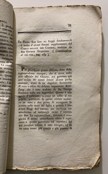 In 8°; 144 pp. Brossura editoriale con titolo e indice delle materie al piatto anteriore. Rinforzo al dorso. Alcuni segni del tempo. Un leggero alone alle prime due carte. Timbri del censore estense alla prima ed all'ultima carta. Esemplare ancora in barbe e nel complesso, in buone condizioni di conservazione. Fra gli articoli contenuti, da segnalare, in particolare: Giorgio Staunton, Versione dal chinese del Codice penale della China; Macartney T., Osservazioni sugli Animali Luminosi; Wollastone Marcet, Del non esistere lo zuccaro del sangue dei diabetici, che pur danno zuccaro dall'urina; Gladwin, Relazione sulle Miniere di Diamanti nella provincia di Bundeleund; Davy, Descrizione di una caccia della Tigre. Non comune.
