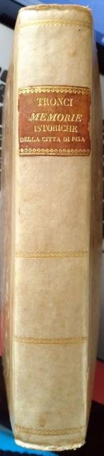 Vincenzo Bonfigli, Livorno, 1682. In 8vo grande, front. con stemma mediceo a sei palle, pp. (30), 508, leg. orig. in tutta perg. rigida, titolo ms. al dorso. Edizione originale di quest’opera che può essere a merito considerata una delle più vaste fonti di notizie per la storia di Pisa. (Cfr. Lozzi pag. 3684: “Bello e raro”; Piantanida, pp. 933: “non ci sono note altre edizioni di quest’importante opera postuma divenuta oggi molto rara”; Romagnoli: “assai raro”). Pergamena per lo più scurita e con imperfezioni, tagli scuriti, pagine leggermente ingiallite e ondulate, notazioni a lapis alla prima bianca, alcune pagine si presentano più brunite; nell'insieme trattasi di contenute imperfezioni e di esemplare comunque completo e ben fruibile.