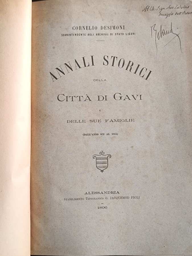 <span style="font-style: normal;">In-folio (cm. 30,4), legatura coeva in mezza pelle bordeaux ad angoli, dorso liscio con titolo, filetti e fregi in oro (tracce d'usura e difetti alle cuffie), piatti in percallina; conservata la brossura editoriale a stampa con invio autografo dell'autore al «sign. avv. Calvino»; pp. [6] 284 [26] IX [1b] in ottimo stato; con uno stemma al frontespizio e testatina in xilografia; </span><i>Ex Libris </i>illustrato applicato al contropiatto, un altro impresso al risguardo e ad alcune prime carte, antica firma di possesso alla brossura e al frontespizio. Edizione originale di quest'opera dello storico Desimoni dedicata alla città natale. Buon esemplare. (NP7)