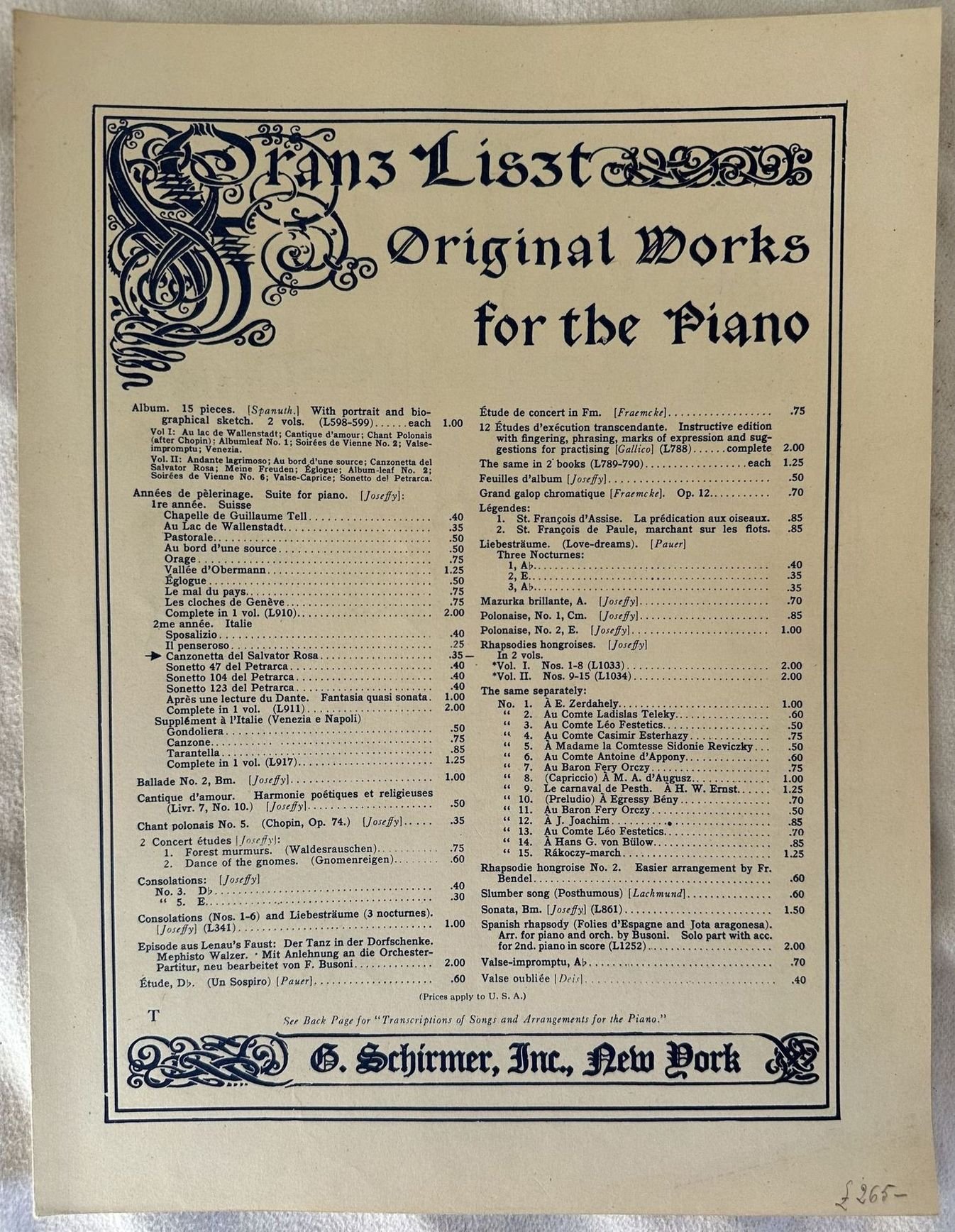 Edizione del 1909 della melodia "Canzonetta del Salvator Rosa"dall'opera Annees de Pelerinage di Franz Liszt (1811-1886). Decorazioni in copertina In ottime condizioni. Copertina editoriale in ottime condizioni con lievi usure marginali. Legatura in buone condizioni. Pagine in ottime condizioni con rare fioriture. In Folio. cm. 30,5x23. Pp. 5.Edition of 1909 of the melody "Canzonetta del Salvator Rosa" from the work dall'opera Annees de Pelerinage by Franz Liszt (1811-1886). Decorations in the cover. In very good conditions. Editorial cover in very good conditions lightly worn in the extremities. Binding in good conditions. Pages in very good conditions with occasional foxing. In Folio. cm. 30,5x23. Pp. 5.<BR><BR>