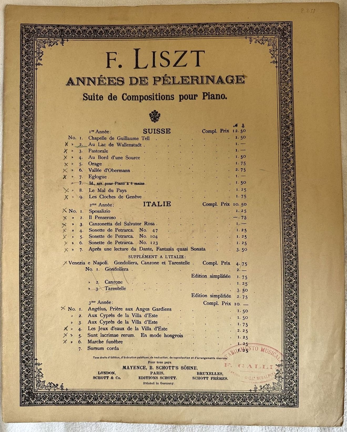 Edizione del 1912 della melodia "Au Lac de Wallenstadt" di Franz Liszt (1811-1886) numero II dall'opera "Annees de pelerinage". In discrete condizioni. Copertina editoriale in discrete condizioni con lievi usure marginali. Piatti quasi staccati.Legatura assente. Pagine in buone condizioni con rare fioriture. In Folio. cm. 34x27. Pp. 5.Edition of 1912 of the melody "Au Lac de Wallenstadt" by Franz Liszt (1811-1886) number two from the opera "Annees de pelerinage". In fair conditions. Editorial cover in fair conditions lightly worn in the extremities. Plates detached Binding lacks. Pages in good conditions with occasional foxing. In Folio. cm. 34x27. Pp. 5.