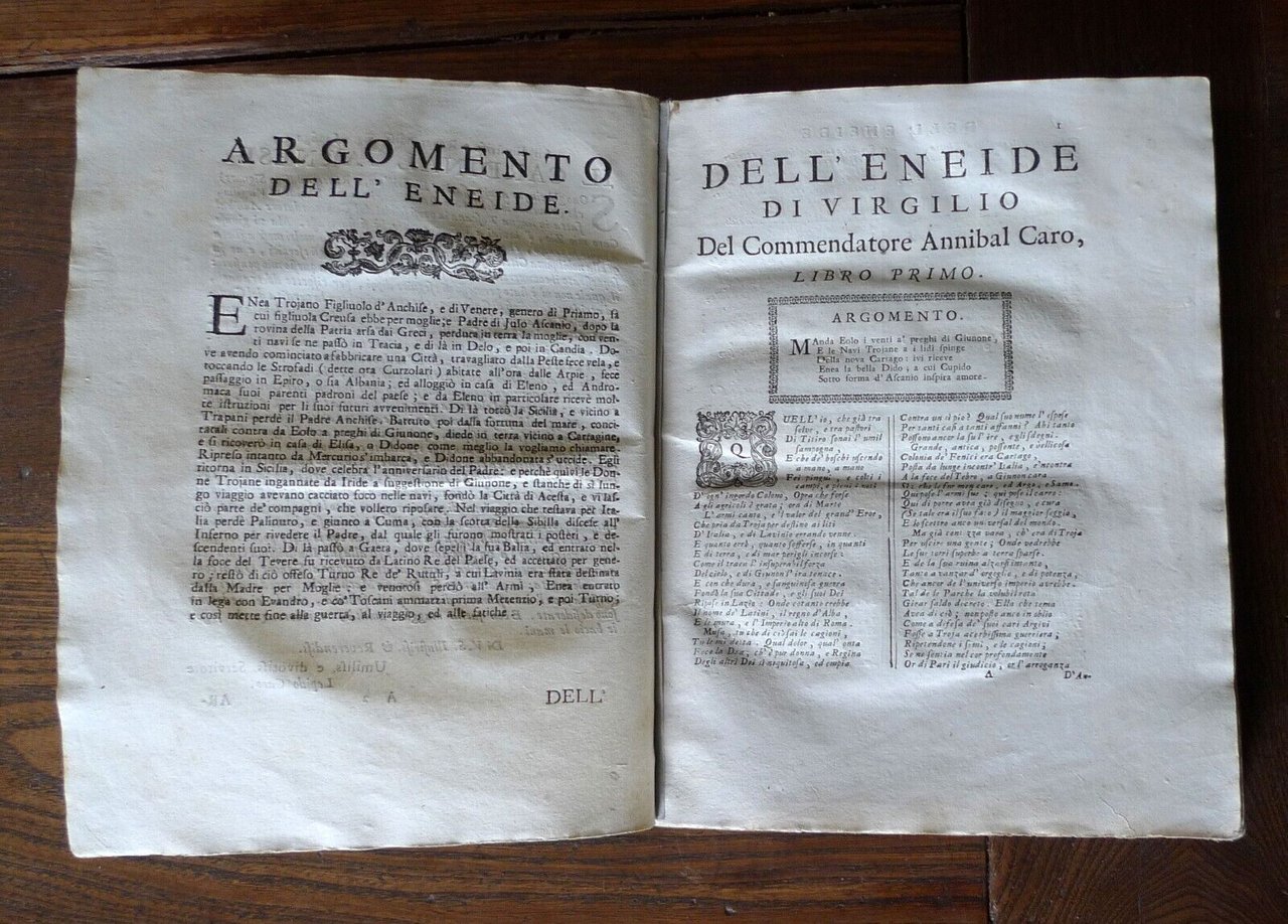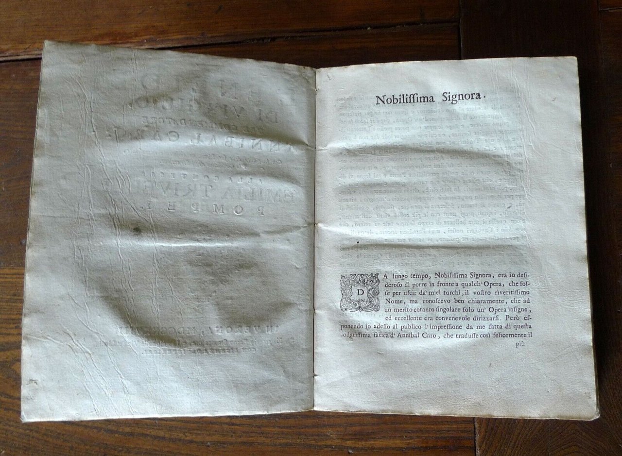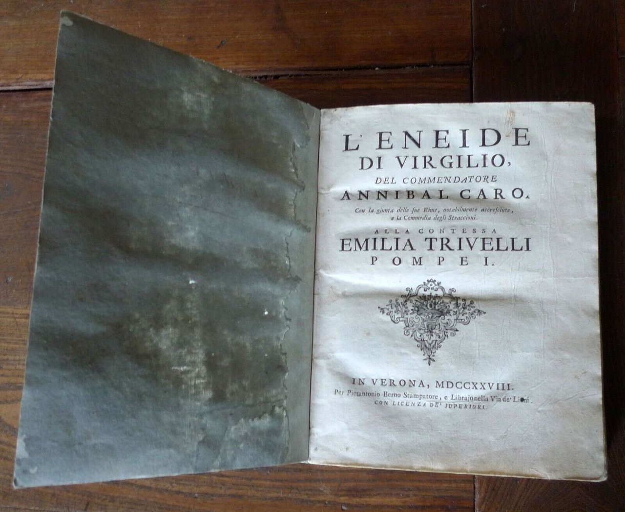 L'ENEIDE DI VIRGILIODEL COMMENDATORE ANNIBAL CARO.CON LA GIUNTA DELLE SUE RIME,NOTABILMENTE ACCRESCIUTE,E LA COMMEDIA DEGLI STRACCIONI.ALLA CONTESSA EMILIA TRIVELLI POMPEI.IN VERONA, MDCCXXVIII (1728),Per Pierantonio Berno Stampatore, e Librajo,copertina morbida, rilegatura rifatta in carta grezza,con sovraccoperta in carta, 25x19,5 cm., pp. [6], 151; 32; 40,testo su 2 colonne,peso: g.500