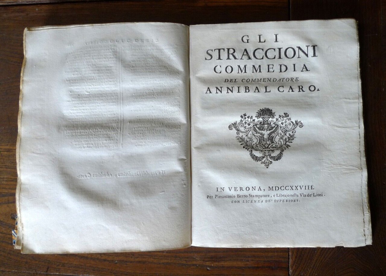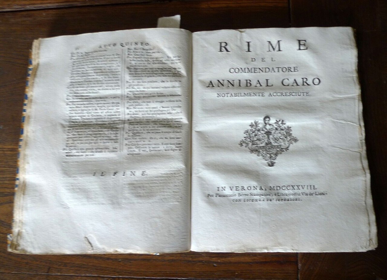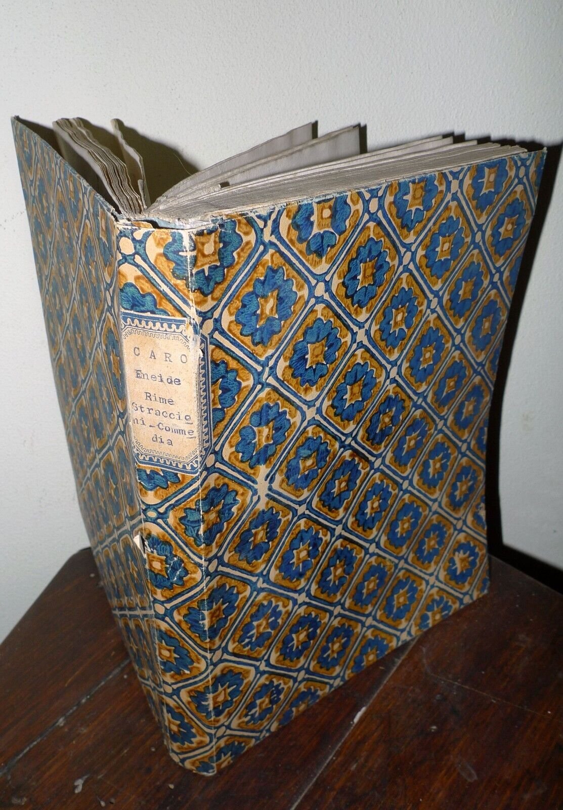 L'ENEIDE DI VIRGILIODEL COMMENDATORE ANNIBAL CARO.CON LA GIUNTA DELLE SUE RIME,NOTABILMENTE ACCRESCIUTE,E LA COMMEDIA DEGLI STRACCIONI.ALLA CONTESSA EMILIA TRIVELLI POMPEI.IN VERONA, MDCCXXVIII (1728),Per Pierantonio Berno Stampatore, e Librajo,copertina morbida, rilegatura rifatta in carta grezza,con sovraccoperta in carta, 25x19,5 cm., pp. [6], 151; 32; 40,testo su 2 colonne,peso: g.500