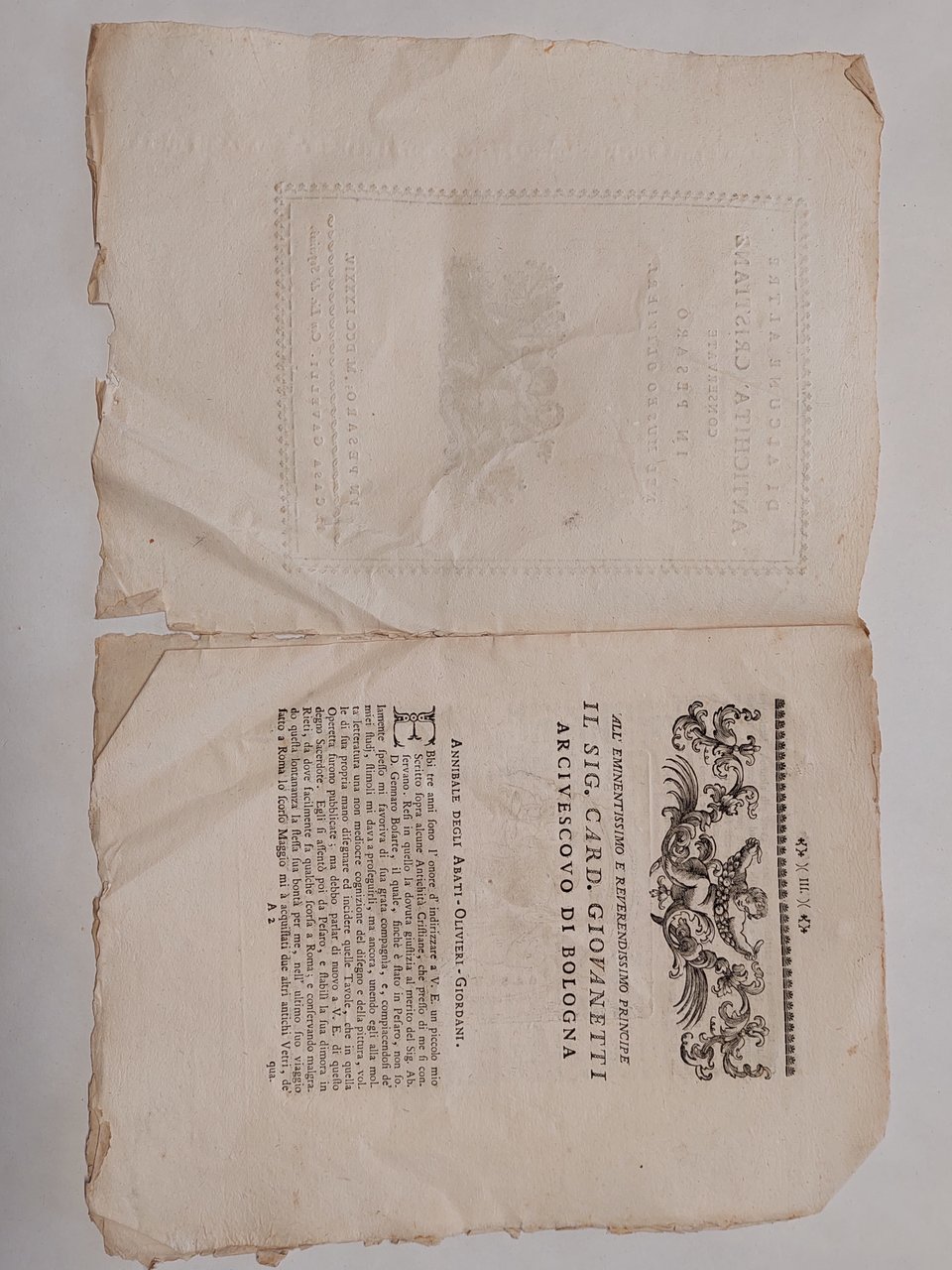 Annibale degli Abbati Olivieri Giordani Di alcune altre antichità cristiane conservate in Pesaro nel museo Olivieri Casa Gavelli Pesaro 1784 cm. 28 x 21 pp. VII.