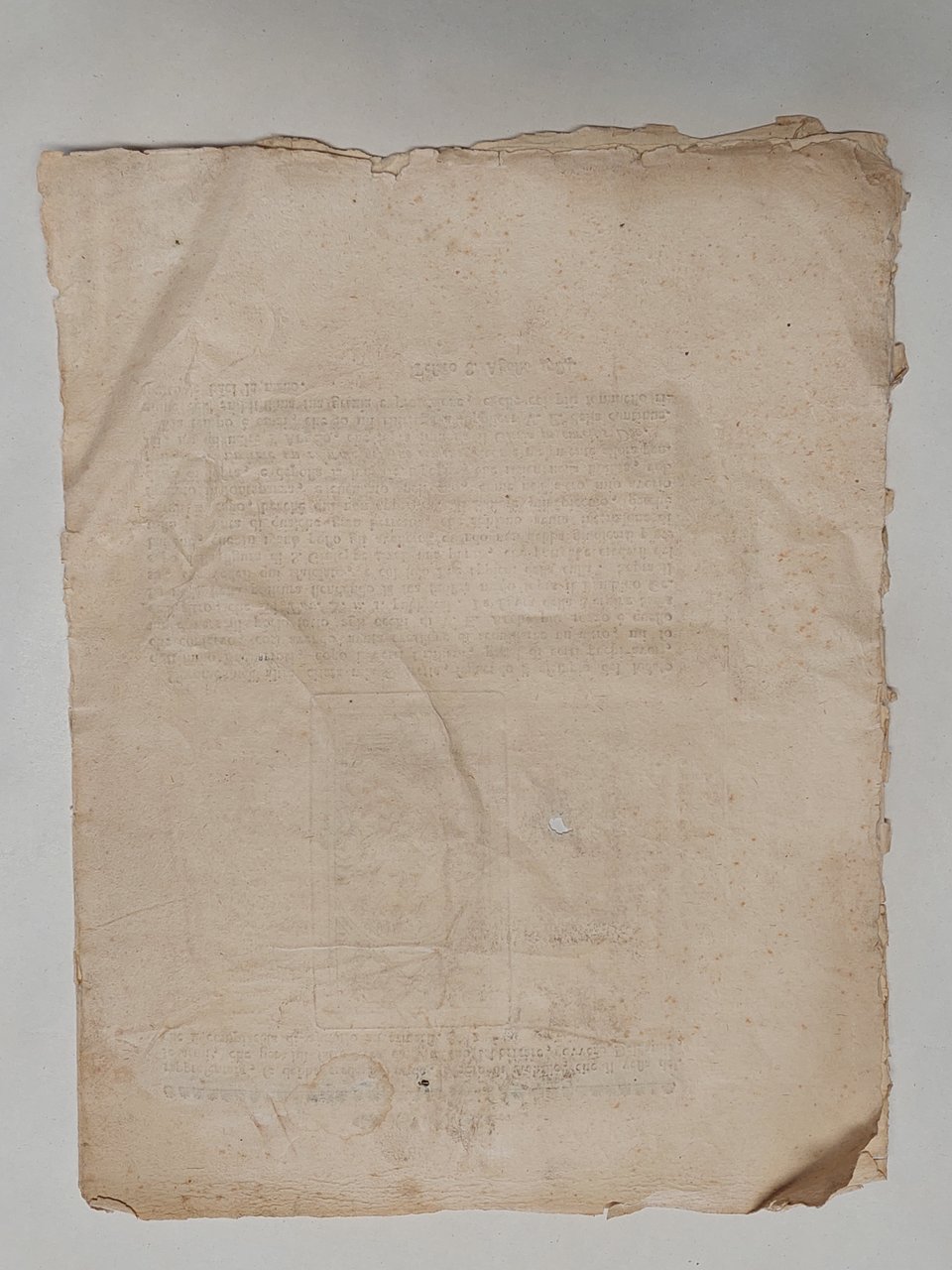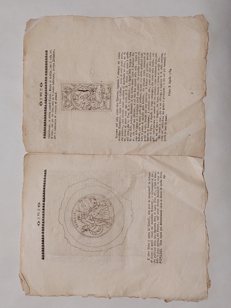Senza copertina, a fogli sciolti, probabilmente mai rilegato perché non sono presenti i fori della legatura, carta vergata coeva con filigrana, volume in barbe, in precarie condizioni, strappi alla piega centrale del frontespizio, e nella parte inferiore sinistra di tutte le pagine, tre belle incisioni all'interno,(11,5 x 10- 15 x 13 - 9 x 5,5) due fori a pagina VII. Alcune macchie e fioriture all'ultima pagina bianca