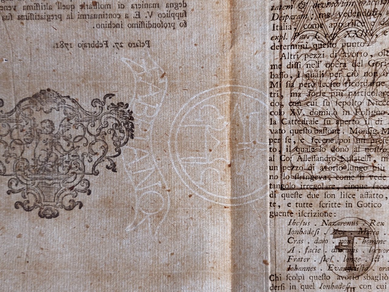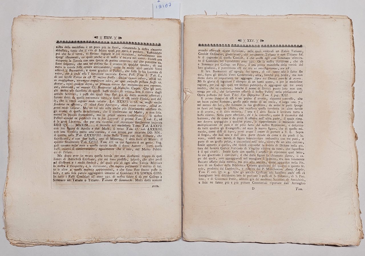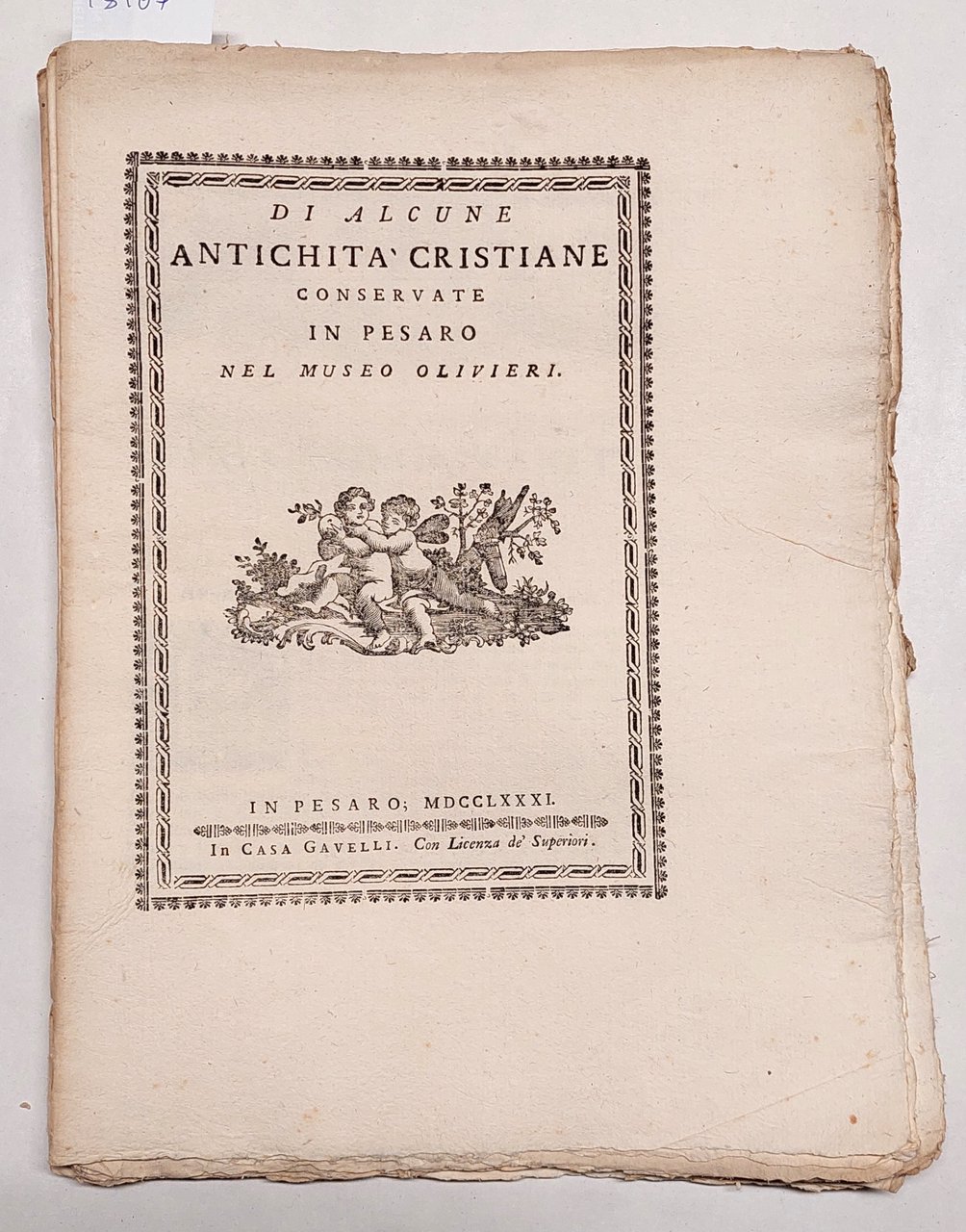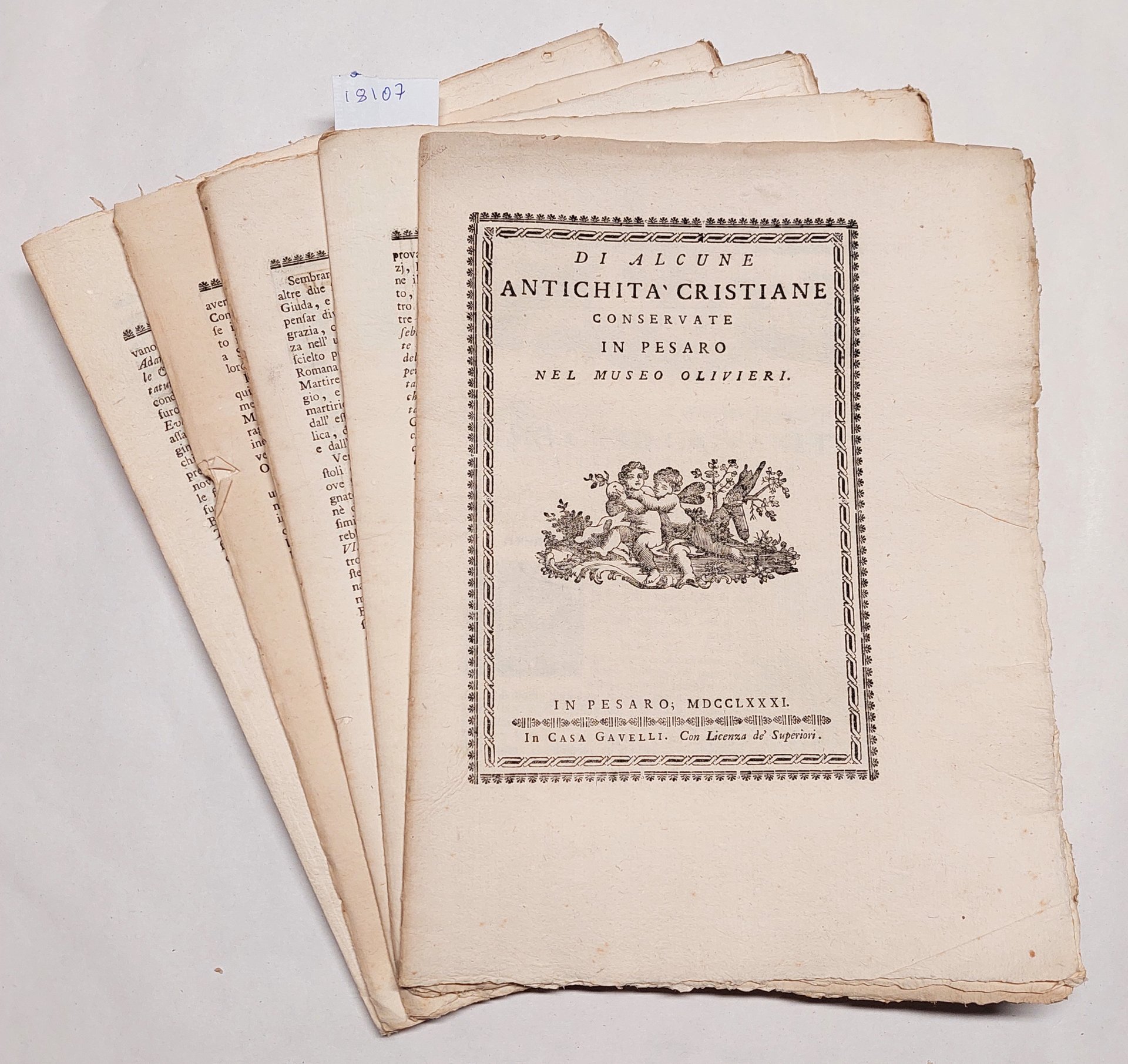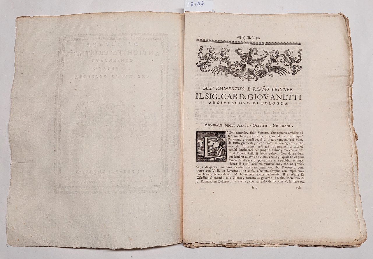 Annibale degli Abbati Olivieri Giordani Di alcune antichità cristiane conservate in Pesaro nel museo Olivieri Casa Gavelli Pesaro 1781 cm. 29 x 22 pp. XXXVII + 3 bianche.