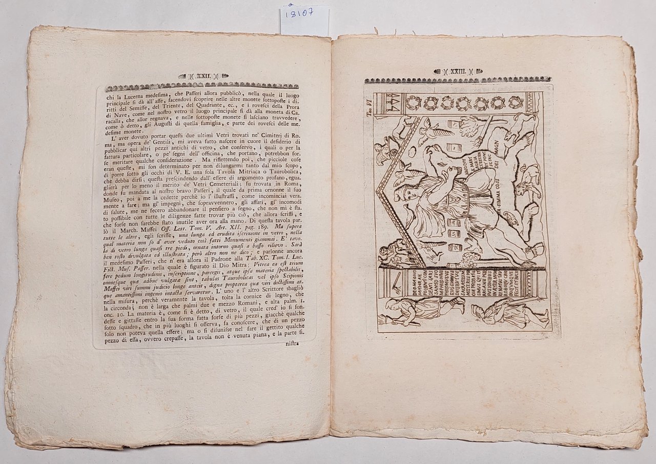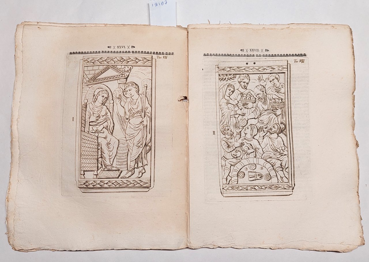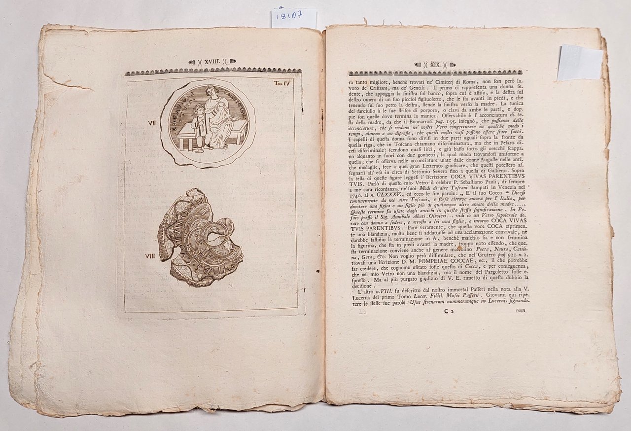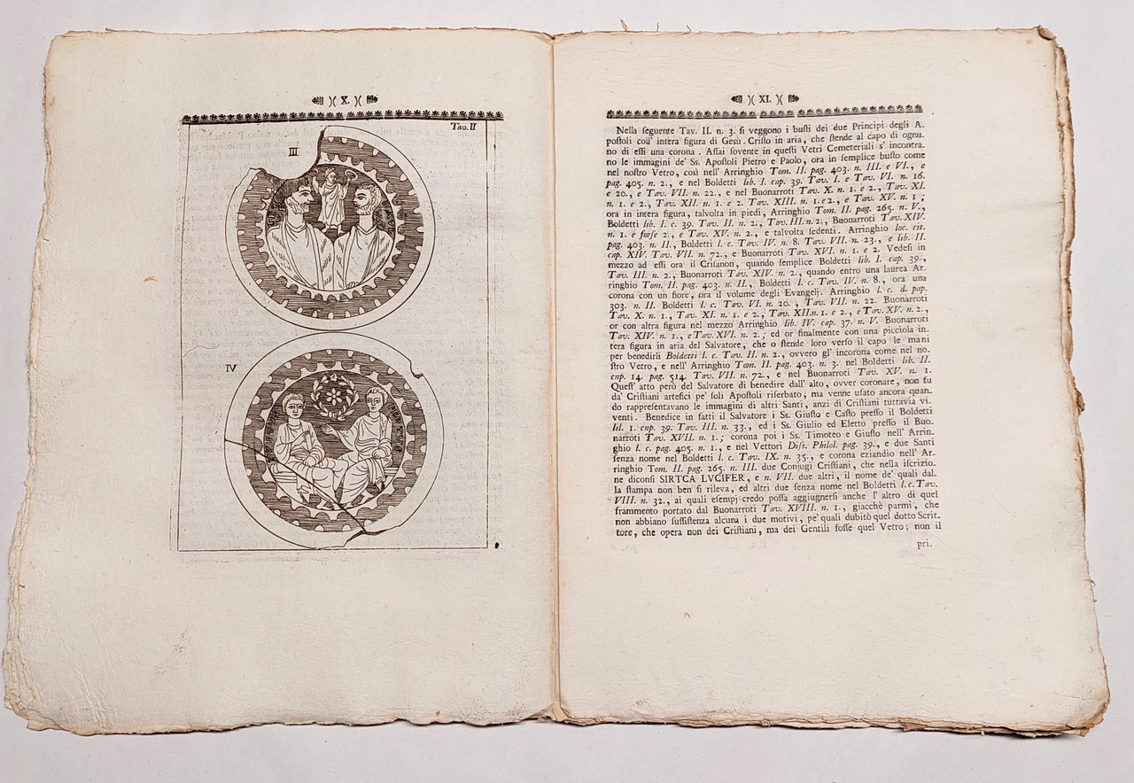 Senza copertina, a fogli sciolti, probabilmente mai rilegato perché non sono presenti i fori della legatura, carta vergata coeva con filigrana, volume in barbe,10 tavole incise nel testo a piena pagina , bella vignetta incisa al frontespizio, testatina e capolettera incisa a pagina 3 , margini irregolari leggermente bruniti uno strappo al margine destro di cm 5 pag. XVII, e pag. XIX, strappo con mancanza al margine interno del fascicolo XXV-XXXII, le cui pagine risultano leggermente brunite. Fioriture su gran parte delle pagine, umidità alle ultime otto pagine all'angolo inferiore destro.