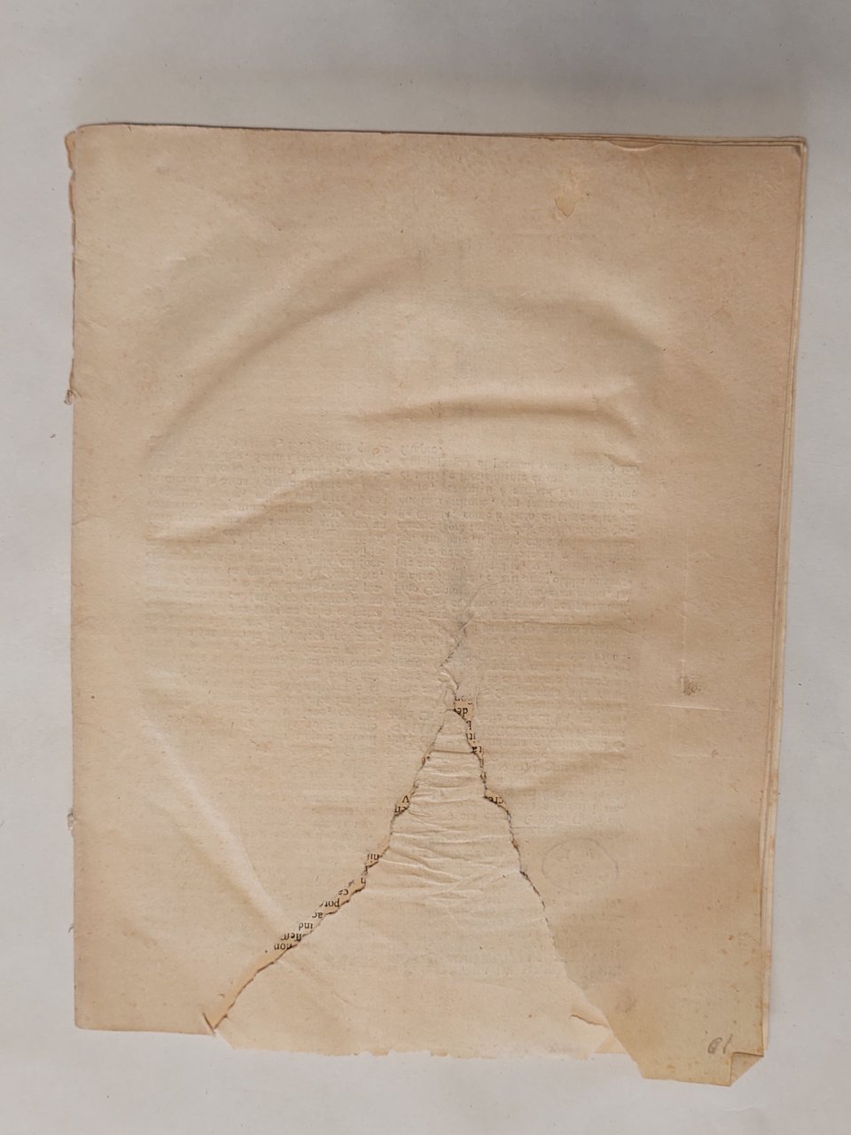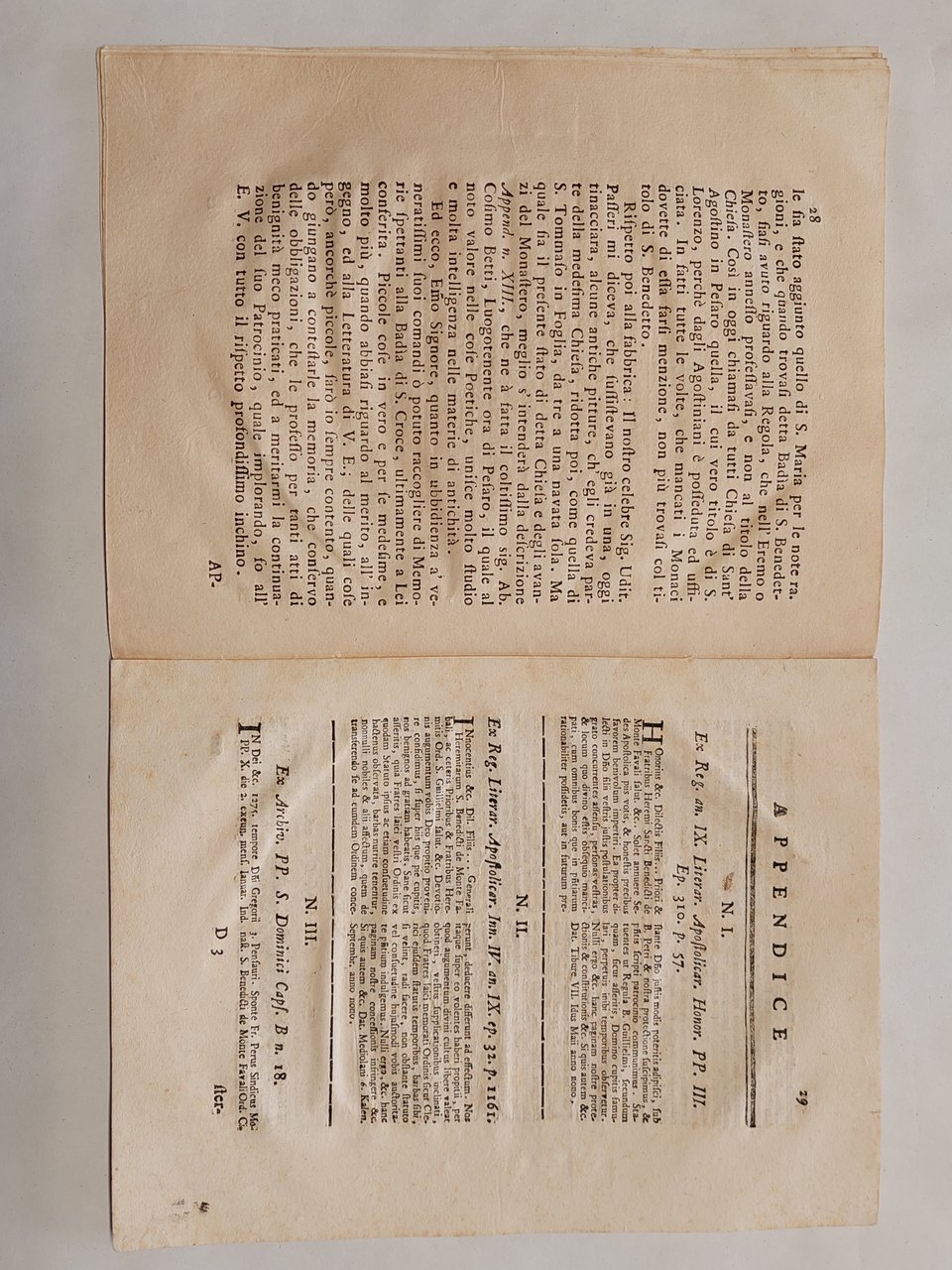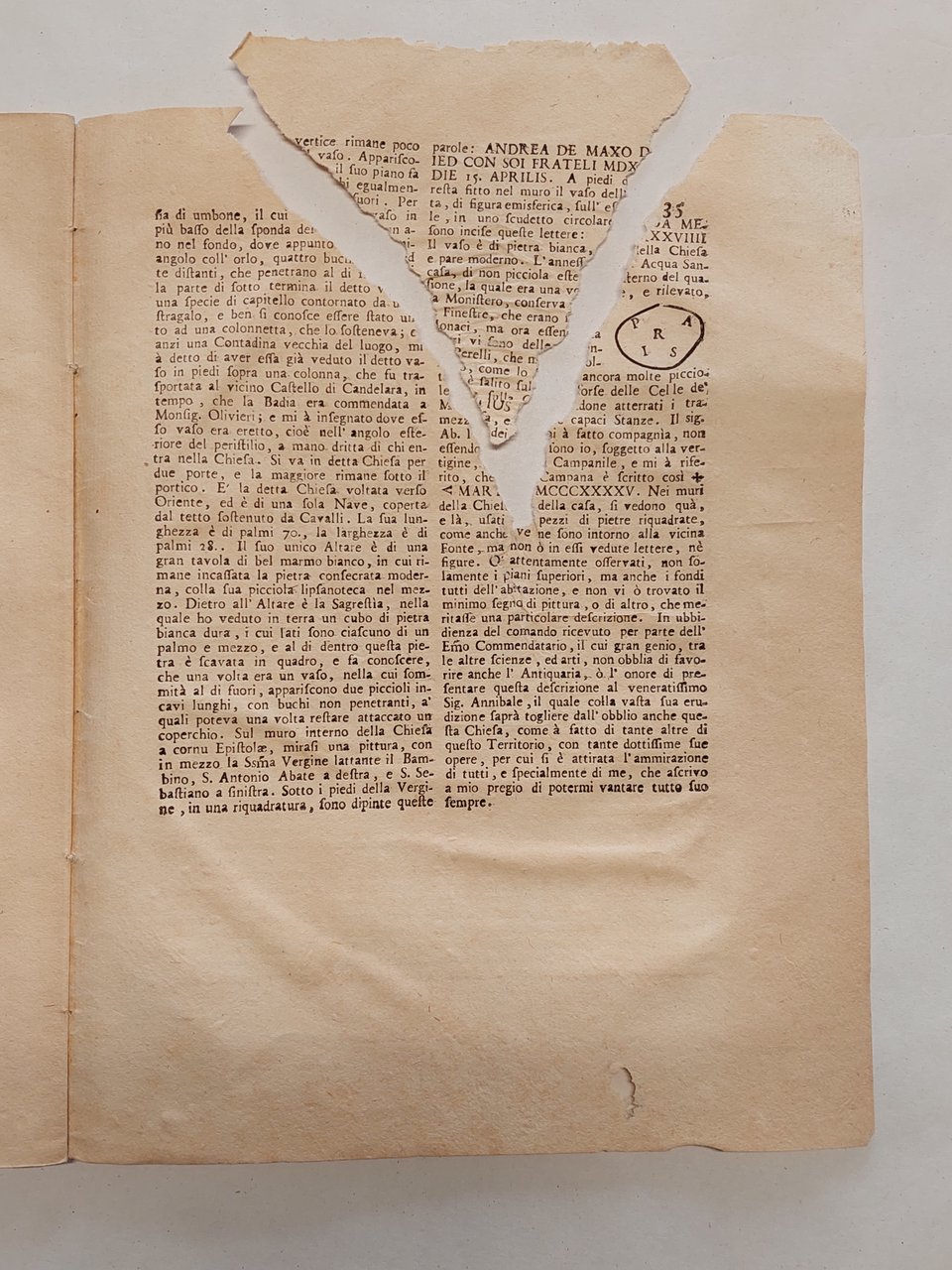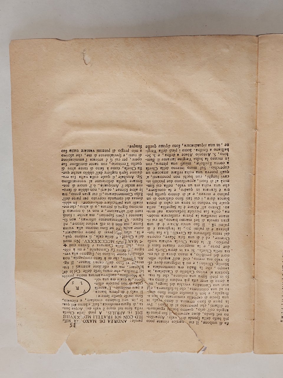 Senza copertina ma rilegato, anche se un po' allentato, bella vignetta illustrata al frontespizio, raffigurante una medaglia testatina e capolettera illustrati a pagina 3, pagine interne ondulate e leggermente brunite, leggere ma diffuse fioriture su tutte le pagine, grosso strappo di centimetri 13 per 11 all'ultima pagina, la parte strappata che è restaurabile, un foro al margine inferiore dell'ultima pagina.