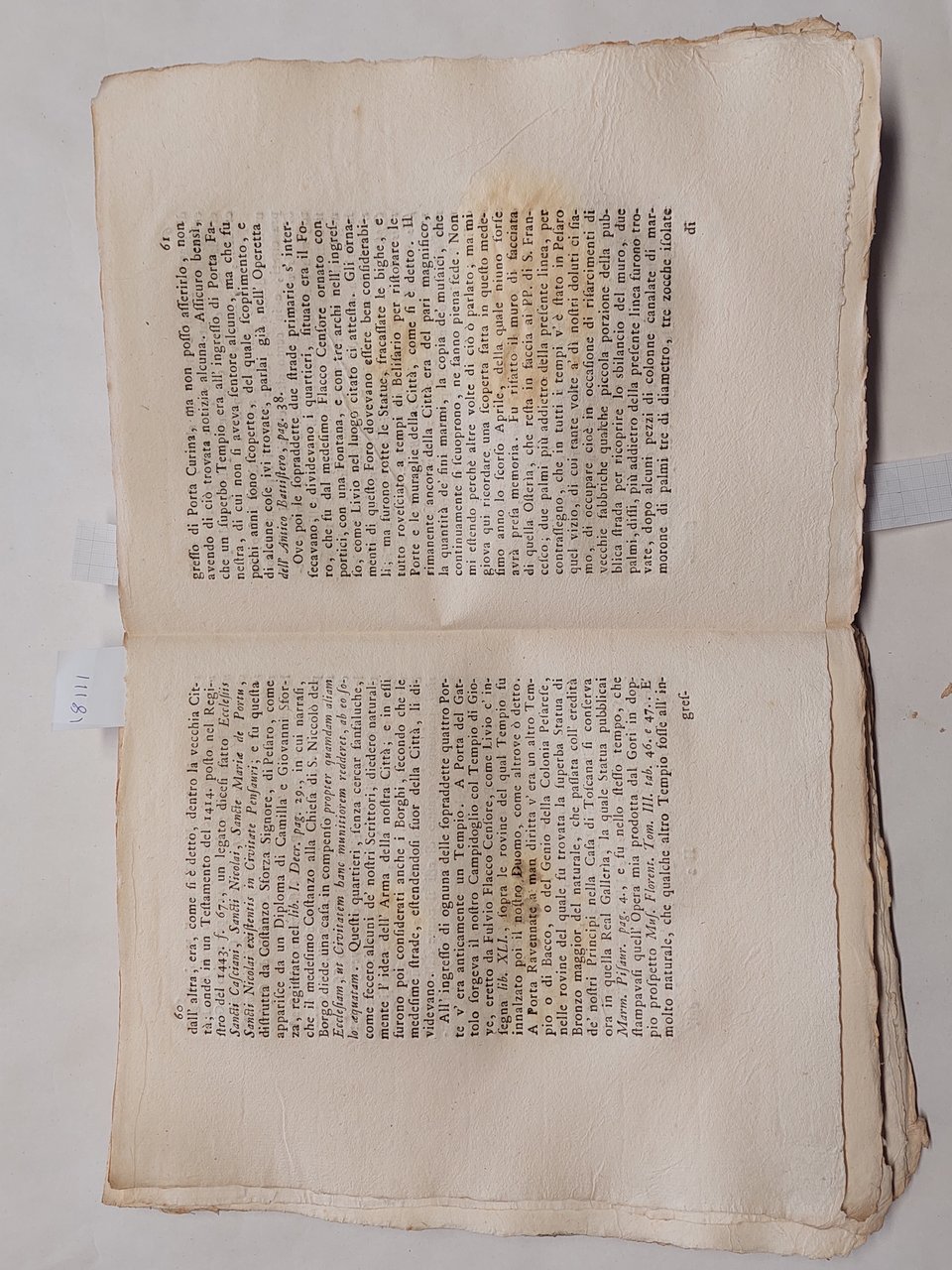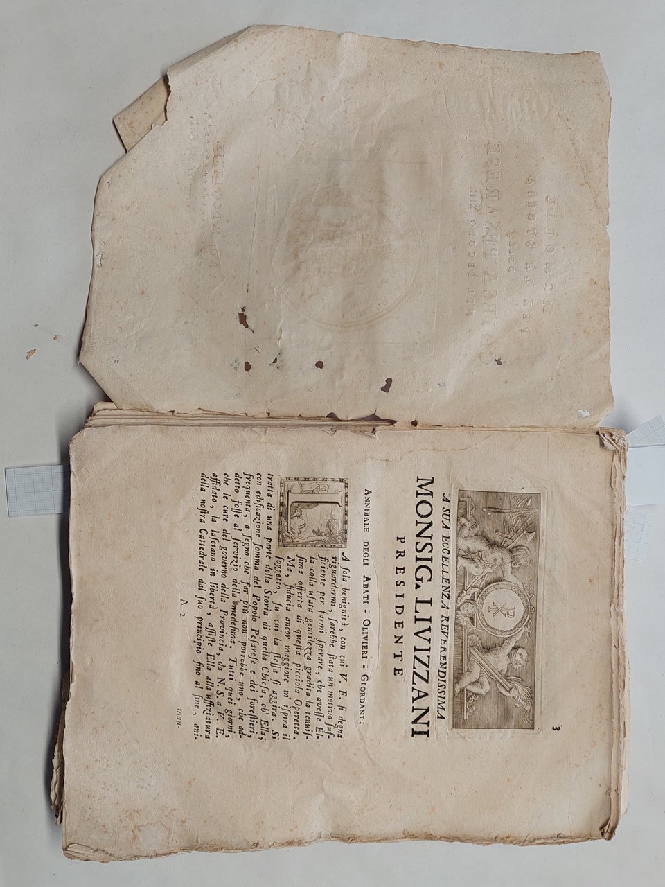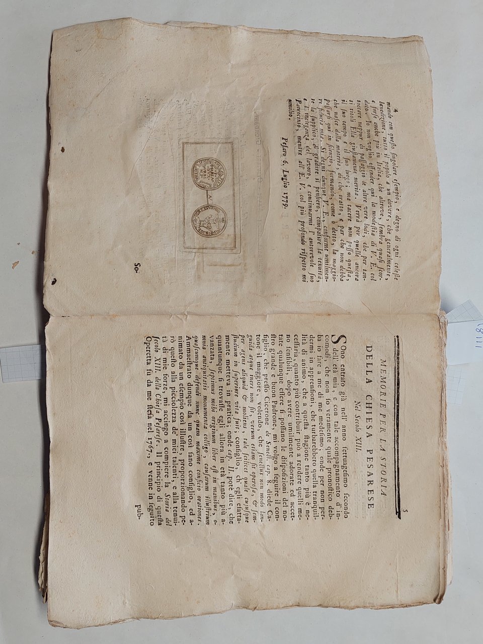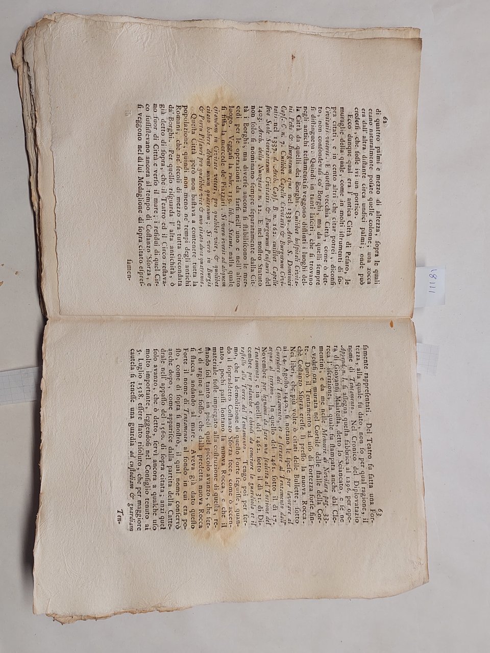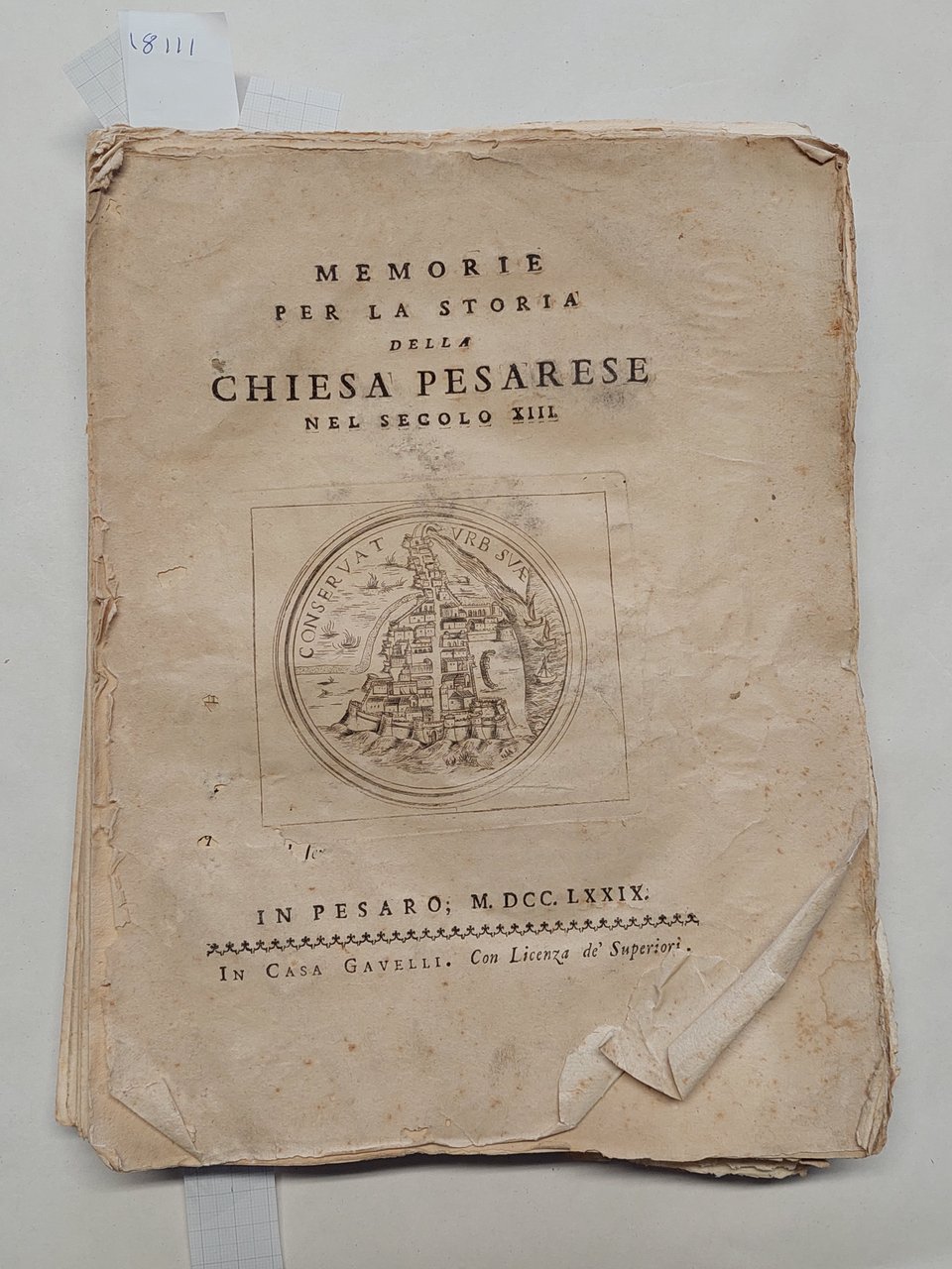 Senza copertina, a fogli sciolti, probabilmente mai rilegato perché non sono presenti i fori della legatura, carta vergata coeva con filigrana, volume in barbe, bella vignetta incisa al frontespizio che raffigura la città di Pesaro, testatina e capolettera illustrato a pagina 3, illustrazione che raffigura una medaglia a pagina 4, una bella veduta incisa a pagina 74 cm. 11 x 13,5. Un grosso strappo con mancanze nella parte inferiore del frontespizio. Una grossa macchia da pagina 59 a pagina 64 ma testo leggibile, qualche mancanza e piccolo strappo ai margini, qualche piccolo foro ai margini tagli con tracce di polvere, brunitura in corrispondenza della piega centrale di quasi tutte le pagine, su alcune pagine qualche strappo in corrispondenza della piega centrale
