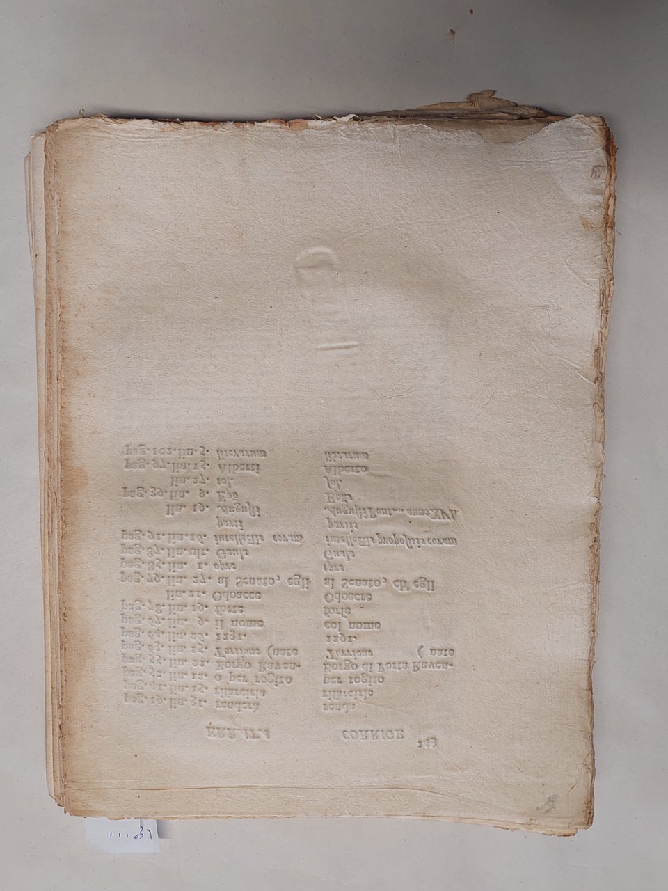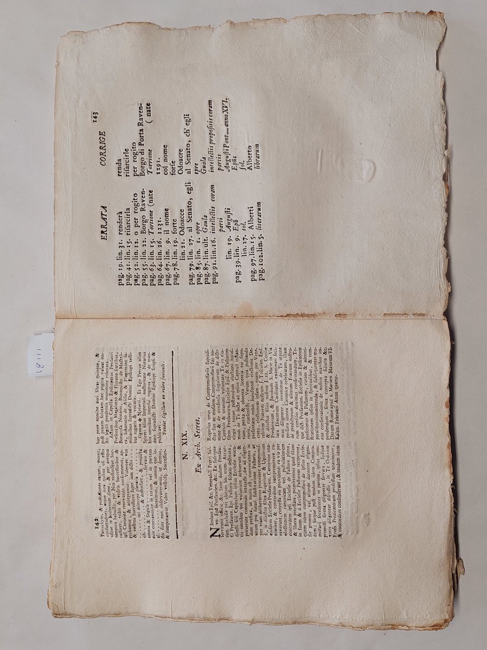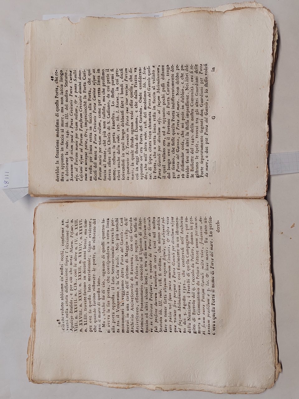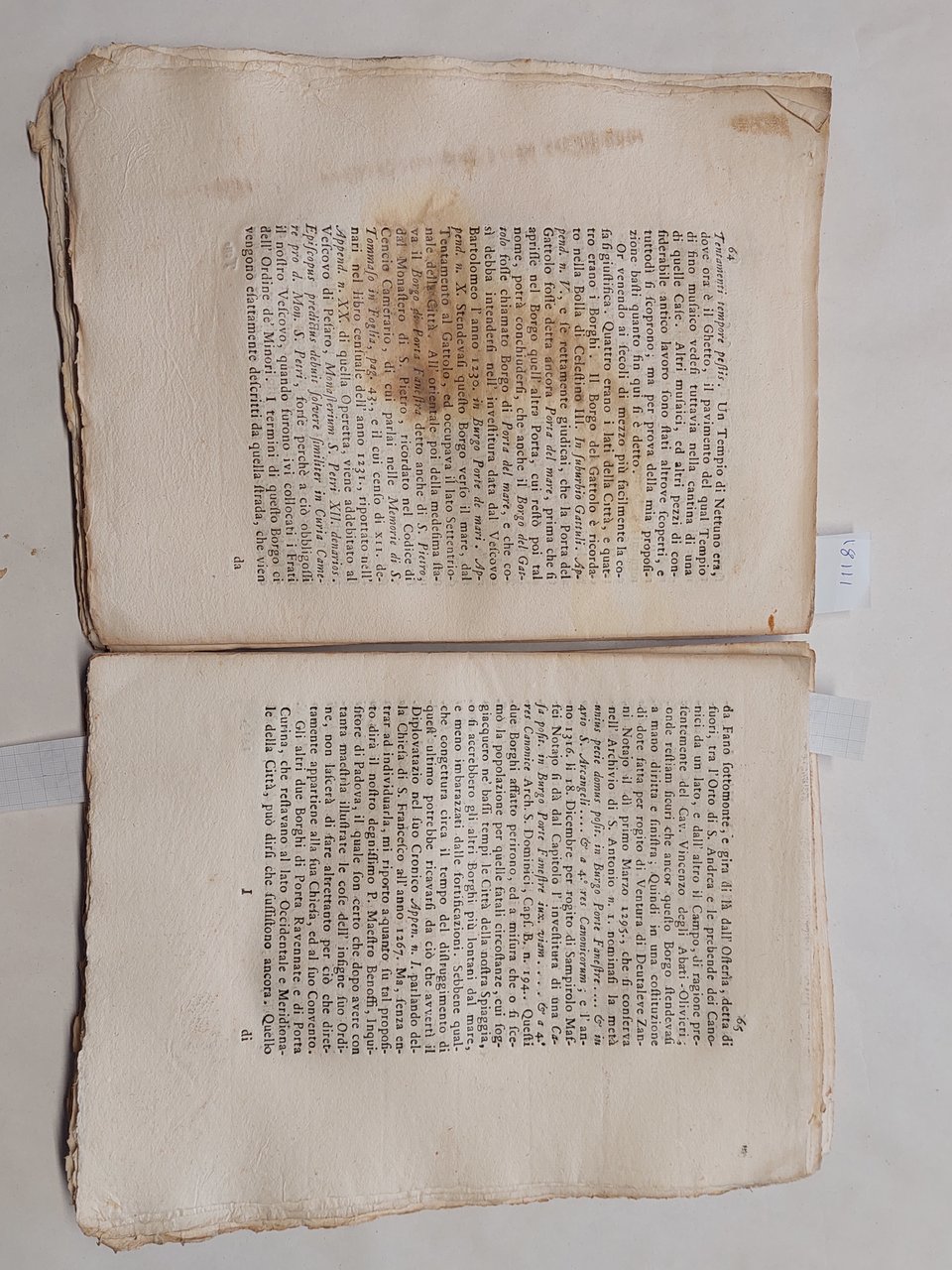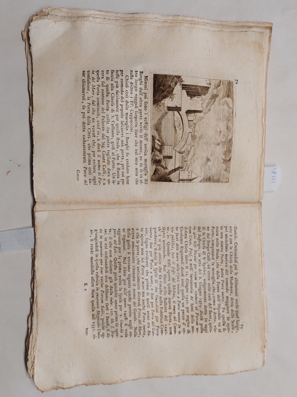 Senza copertina, a fogli sciolti, probabilmente mai rilegato perché non sono presenti i fori della legatura, carta vergata coeva con filigrana, volume in barbe, bella vignetta incisa al frontespizio che raffigura la città di Pesaro, testatina e capolettera illustrato a pagina 3, illustrazione che raffigura una medaglia a pagina 4, una bella veduta incisa a pagina 74 cm. 11 x 13,5. Un grosso strappo con mancanze nella parte inferiore del frontespizio. Una grossa macchia da pagina 59 a pagina 64 ma testo leggibile, qualche mancanza e piccolo strappo ai margini, qualche piccolo foro ai margini tagli con tracce di polvere, brunitura in corrispondenza della piega centrale di quasi tutte le pagine, su alcune pagine qualche strappo in corrispondenza della piega centrale
