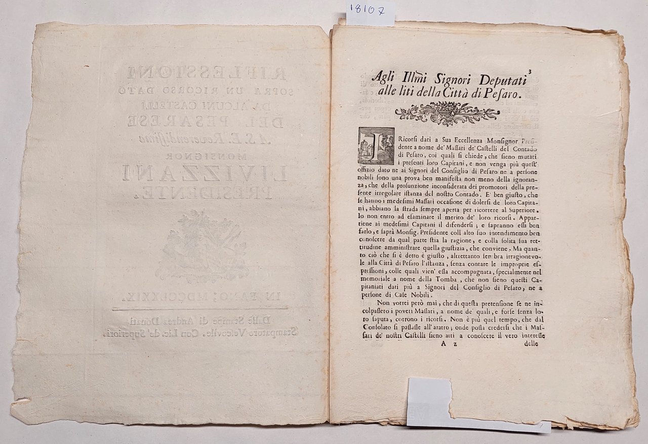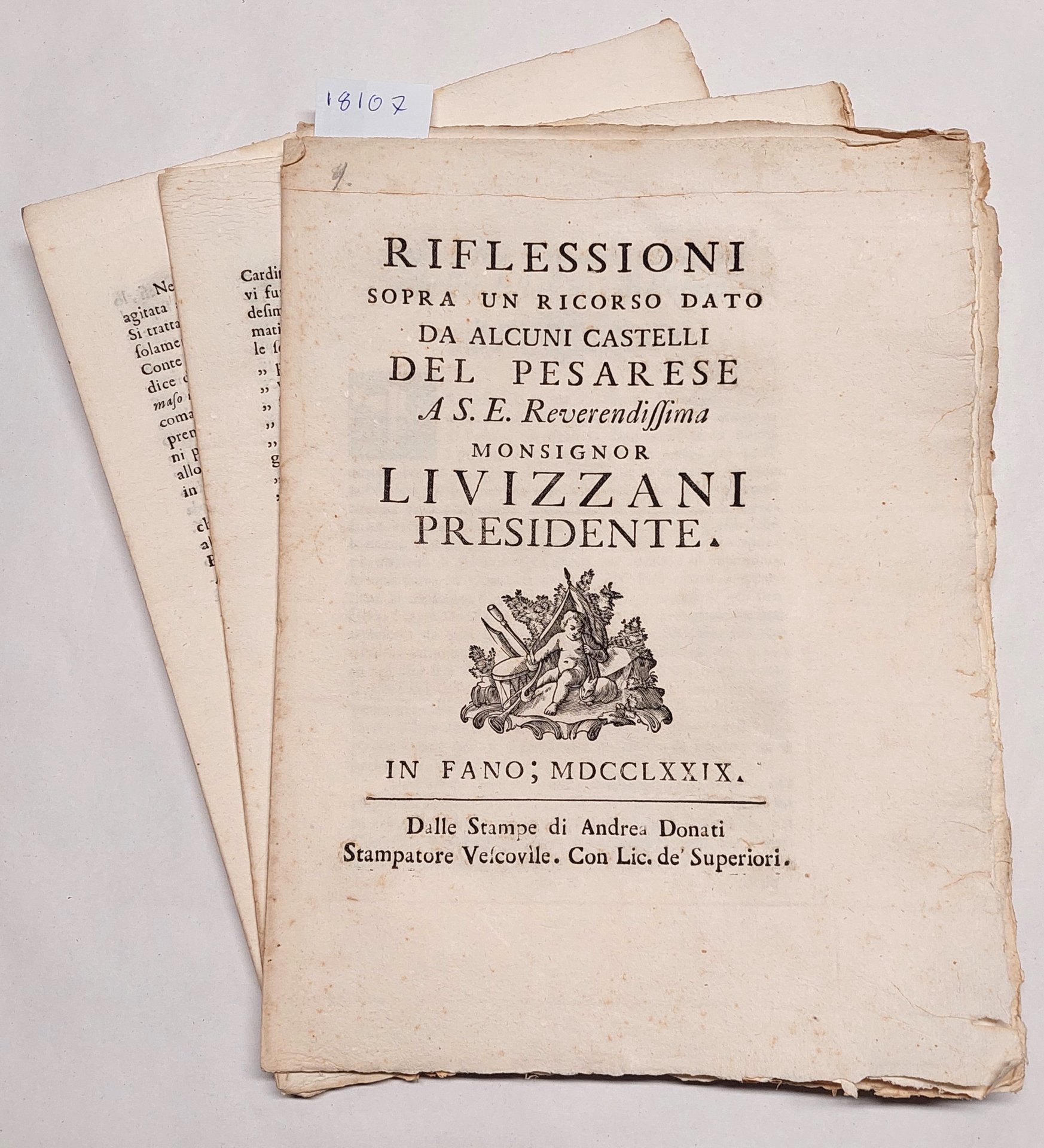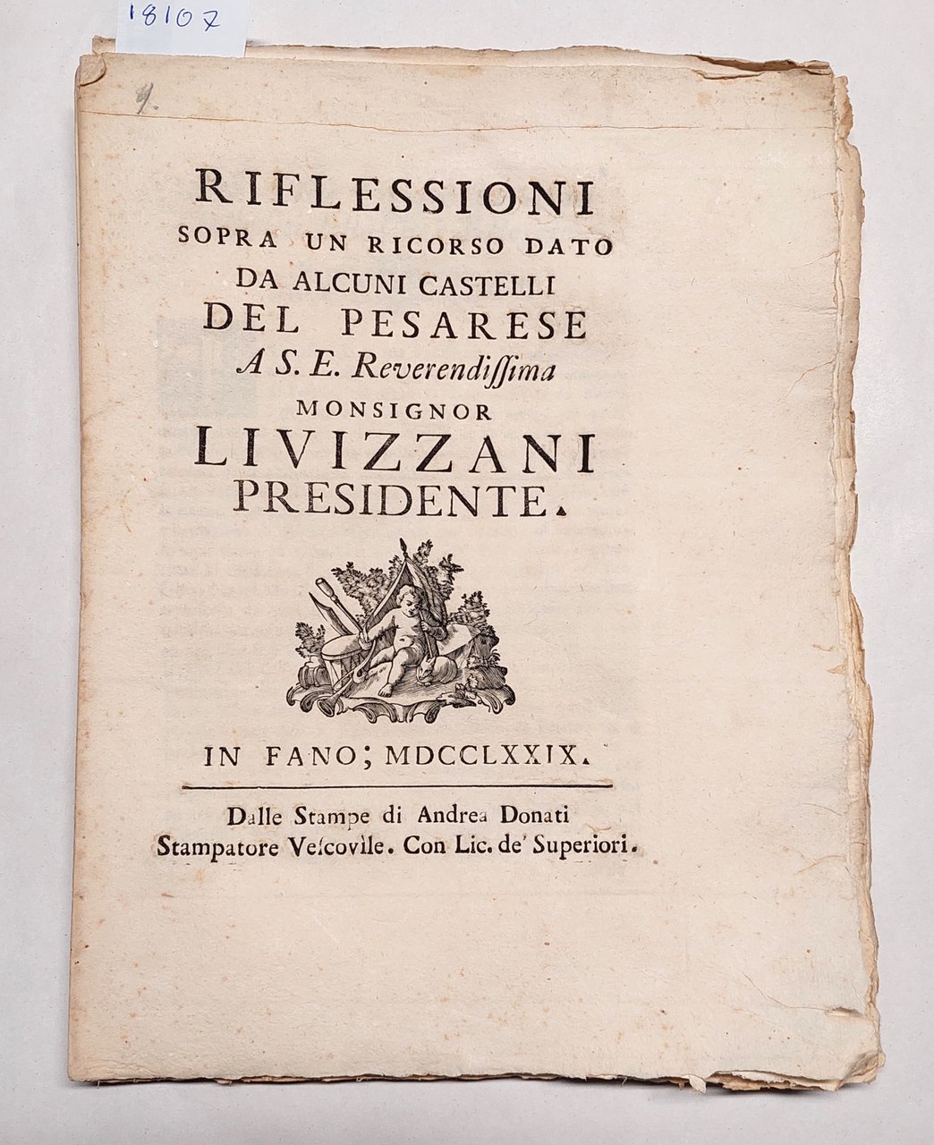 Annibale degli Abbati Olivieri Giordani Riflessioni sopra un ricorso dato da alcuni Castelli del pesarese. A S. E. Reverendissima Monsignor Livizzani Presidente