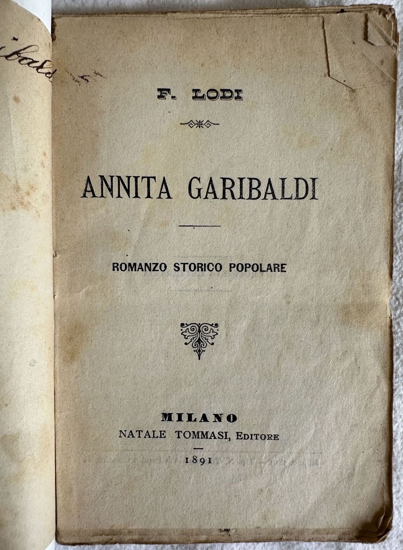Raro romanzo storico del 1891 sulla figura di Annita Garibaldi scritto da F. Lodi. Firma e antiche note manoscritte all'occhietto. In buone condizioni. Copertina moderna decorata in ottime condizioni generali. Legatura in buone condizioni. Pagine in buone condizioni con rare fioriture. In 16. cm 16x10,5. Pp. 124+(4). Scarce historical novel of 1891 about the figure of Annita Garibaldi written by F. Lodi. Signature and antique handwritten notes in the first title page. In good condtions. Soft modern decorated cover in very good conditions. Binding in good conditions. Pages in good conditions with occasional foxing. In 16. cm 16x10,5. Pp. 124+(4).