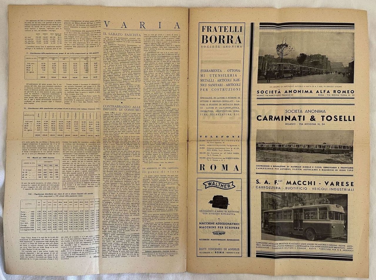Numero del gennaio 1936 di questa rivista su Roma fondata dal militare politico e giornalista italiano Giuseppe Bottai (Roma 1895-Roma 1959). All'interno: La lupa di Roma e il lupo silano; Vita di Roma: Aspetti di vita romana, I mercati durante le feste natalizia; Rapporti sull'arte (opera lirica, Musica sinfonica, Musica da camera,)Consulta di Roma, Il "Testamento di Augusto", Urbanistica(Per la scomparsa di vicoli di Roma; Piano particolareggiato del quartiere del Rinascimento); Cronache di economia (La composizione della popolazione di Roma ecc.<BR>In buone condizioni.Brossura editoriale in buone condizioni generali con lievi usure ai margini e dorso. Legatura editorialmente assente. All'interno le pagine si presentano in ottime condizioni con rare fioriture. Piegature. In folio. Dim. 47,5x32 cm. Pp. (16).Number of january 1936 of this magazine about Rome established by the military, politican and journalist Giuseppe Bottai (Roma 1895-Roma 1959). Inside: La lupa di Roma e il lupo silano; Life of Rome: Aspects of roman life, Markets during Christmas; Art (lyric opra, Sinfonic music, camera music,)Consulta di Roma, Il "Testamento di Augusto", Urbanistica(For the disappearing of vicoli Rome; Plan of quartiere del Rinascimento); Cronache di economia (Composition of people of Rome ecc. In good conditions. Editorial cover in good general conditions slightly worn in the extremities Binding is editorially missing. Inside pages are in very good conditions with occasional foxings. Foldings. In folio. Dim. 47,5x32 cm. Pp. (16).
