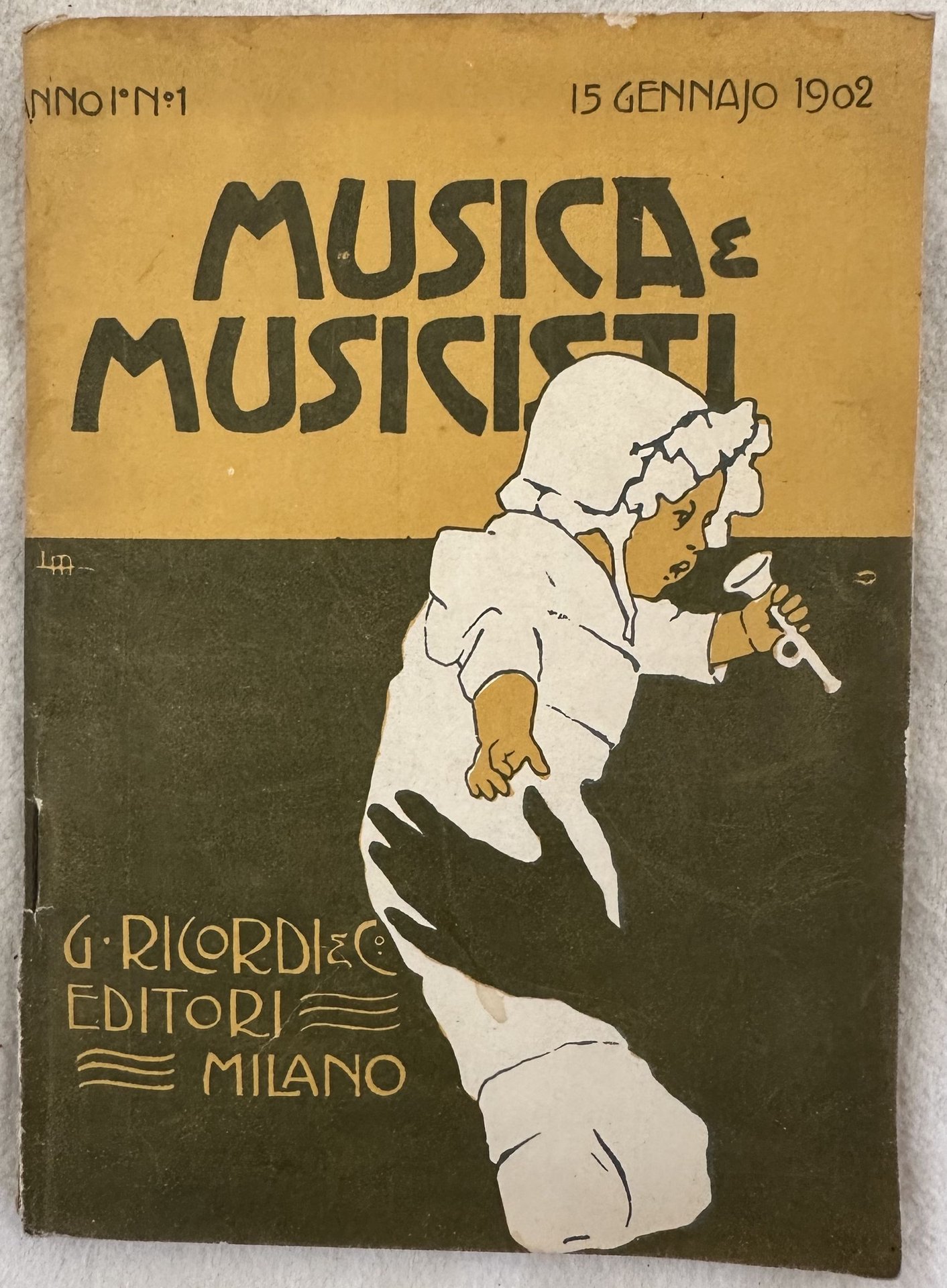 Numero del 15 gennaio 1902 della rivista illustrata bimestrale "Musica e musicisti" All'inizio rubrica con gli appuntamenti musicali del mese di novembre e dicembre. Seguono notizie su vari compositori e alcuni stralci di partiture (Francesco Paolo Tosti, Don Lorenzo Perosi, Alessandro Longo, Luigi Manzotti, Romualdo Marenco, Renato Avena, Luigi Mancinelli, Vincenzo Billi, Gemma Bellincioni, Elena Bianchini Cappelli, Amelia Pinto, Mario Sammarco, Papus ec. Alla fine le novità musicali. In buone condizioni. Copertina morbida in discrete condizioni generali con usure ai margini e dorso. Mancanze al dorso. Legatura in buone condizioni. Pagine in buone condizioni con rare fioriture. In 16. cm. 16,5x12. Pp. 64.Number of the 15th of january 1902 of the illustrated magazine "Musica e musicisti" At the beginning musical dates of the month of november and december. Then information about some composers and parts of their scores (Francesco Paolo Tosti, Don Lorenzo Perosi, Alessandro Longo, Luigi Manzotti, Romualdo Marenco, Renato Avena, Luigi Mancinelli, Vincenzo Billi, Gemma Bellincioni, Elena Bianchini Cappelli, Amelia Pinto, Mario Sammarco, Papus ec. At the end the muscial news. In good conditions. Soft cover in fair conditions lightly worn in the extremities. Lackings in the spine. Binding in good conditions. Pages in good conditions with occasional foxing. In 16. cm. 16,5x12. Pp. 64.