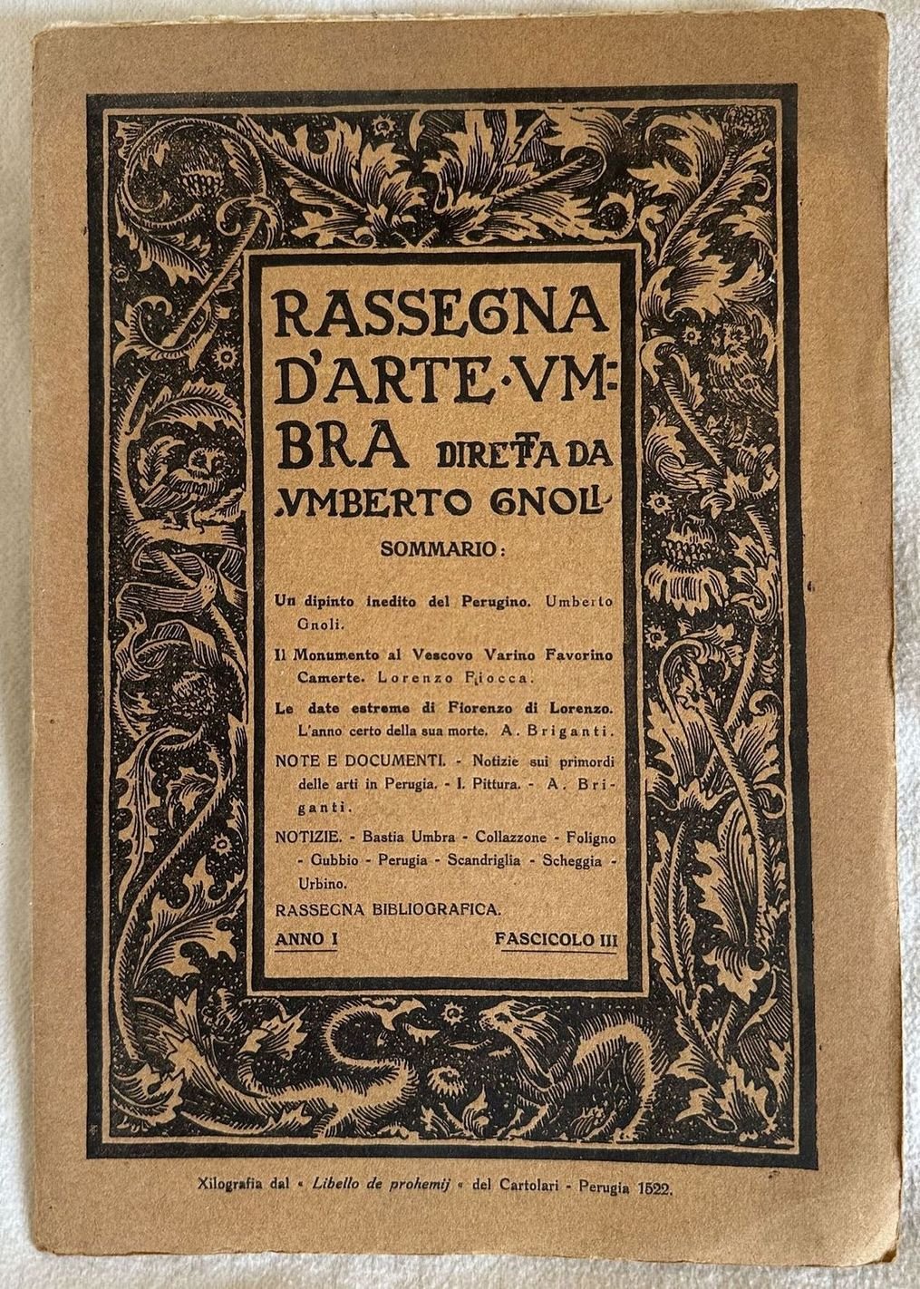 ANNO I PERUGIA 15 AGOSTO 1910 RASSEGNA D'ARTE UMBRA DIRETTA DA UMBERTO GNOLI