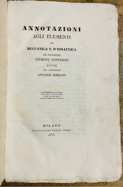 ANNOTAZIONI AGLI ELEMENTI DI MECCANICA E D' IDRAULICA del professore Giuseppe Venturoli / fatte dal professore Antonio Bordoni., seconda edizione con aggiunte.