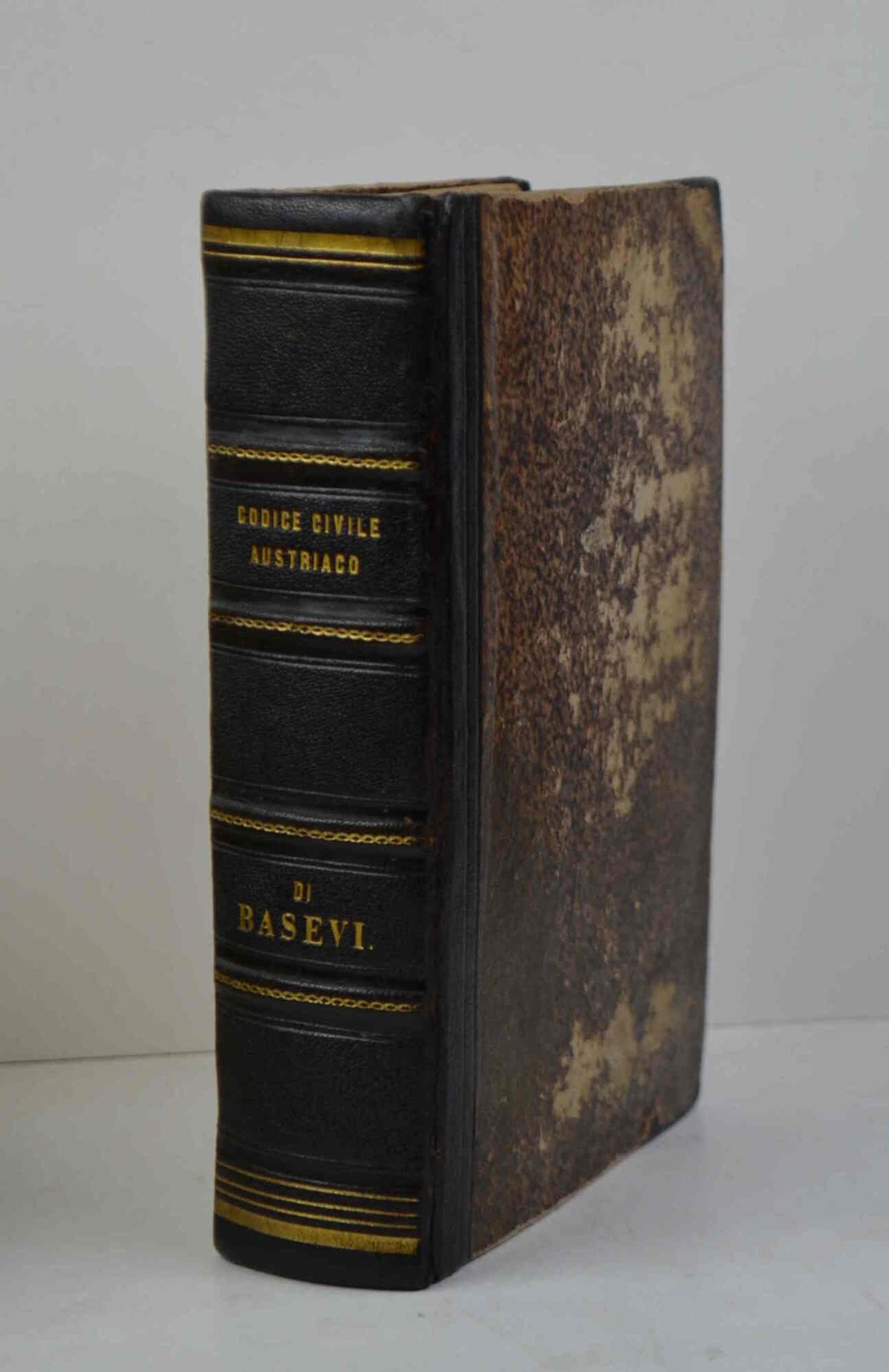 Cm. 22,5, pp. 800. Leg. del tempo in mezza pelle, dorso a piccoli nervi con titoli e filetti in oro. Cerniere abilmente restaurate, esemplare in buono stato di conservazione. . Opera di notevole importanza di Gioacchino Basevi (1778-1867), giurista mantovano che nel 1810 difese il patriota tirolese Andreas Hofer presso il tribunale militare di Mantova. La propensione alla comparazione giuridica contraddistingue la sua produzione dottrinale ed in particolare quest'opera che si caratterizza appunto per l'accostamento delle esperienze giuridiche austriache e francesi alla tradizione romanistica. Cfr., per approfondimenti bio-bibliografici la voce Basevi in Dizionario Biografico degli Italiani (VII, p. 69-70).