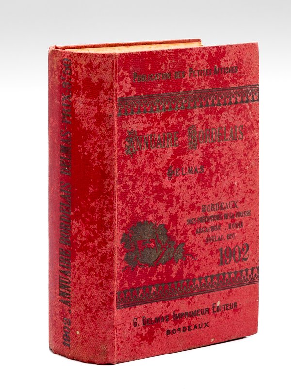 Nombreux renseignements sur les tribunaux, la préfecture, la mairie. liste par profession et liste alphabétique des commerçants, industriels, propriétaires, rentiers et de sa banlieue, 1 vol. fort in-12 reliure pleine percaline rouge éditeur, G. Delmas, Bordeaux, 1902, 1232 pp. avec plan dépliant de Bordeaux et carte dépliante (chemins de fer et plan des théâtres) Avec une étonnante publicité pour l'établissement Le Hammam, 45 rue Vital Carles. Etat satisfaisant (couv. frottée, bon état par ailleurs).