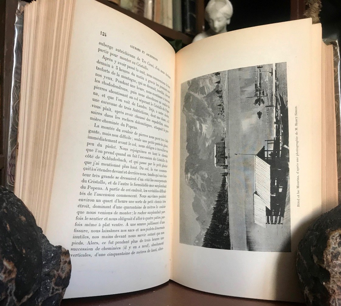Volume in 8 legato in mezza tela, titolo inciso in oro su tassello in pelle al dorso, sguardie marezzate, occhiello, frontespizio, XVI, 586, 304 pp., 62 (+1) illustrazioni complessive, come da elenco, fra tavole ft., illustrazioni n.t. fotografiche e non, in nero e a colori tra cui una tavola fotografica della catena delle Alpi Pennine, Monte Rosa e Piccolo Cervino, una con Cortina dAmpezzo e la Catena del Monte Cristallo, lHotel e il lago Misurina, una Veduta della Valle di Chamouny da una stampa del 1780, spicca anche una bella tavola a doppia pagina e a colori, di farfalle di montagna. Una ulteriore grande tavola f.t. pi volte ripiegata con la topografia a colori dei Pirenei centrali (non presente nellindice). Annata completa della rivista del C.A.F., con la prima parte dedicata a saggi inerenti la montagna (tra cui uno sul Tirolo, uno sul Ghiacciaio del monte Bianco, ecc.), scalate, escursioni, articoli scientifici e di miscellanea, e la seconda dedicata alle attivit ed alla storia delle sezioni dell'Associazione. Annata completa, interessante, in perfetto stato.