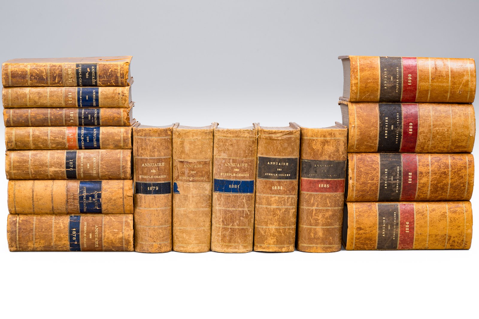 16 vol. fort in-12 reliure de l'époque pleine basane marron, Au Secrétariat de la Société [Société des Steeple-Chases de France ], Paris, 1870-1890 : Annuaire officiel des Steeple-Chases (Lot de 16 Volumes : Années 1870 & 1871 - 1872 - 1874 - 1875 - 1876 - 1877 - 1878 - 1879 - 1880 - 1881 - 1883 - 1885 - 1886 - 1888 - 1889 - 1890) Contenant les comptes-rendus des courses à obstacles courues en France et en Belgique [ Puis en France, en Belgique et en Espagne, à partir de 1886 ] Rare ensemble non suivi de 16 volumes des annuaires des steeple-chases de 1870 à 1890. Etat très satisfaisant (dos frottés avec qq. accrocs, bon état intérieur). Peu commun.