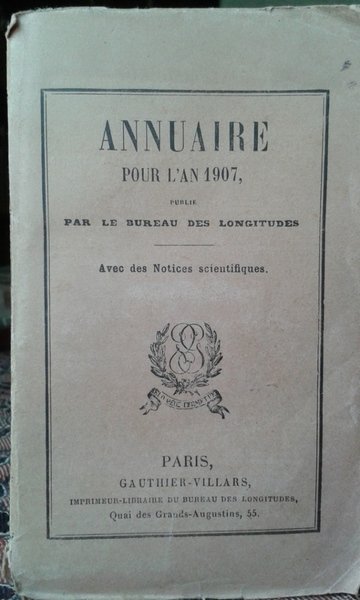 ANNUAIRE POUR L AN 1907 publi par le Bureau des Longitudes. Avec des Notices scientifiques