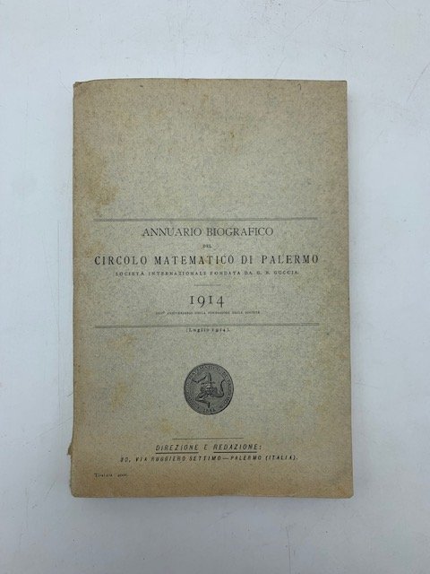 In 8 (cm 14 x 21), pp. 220. Brossura editoriale. Annuario 1914 del del Circolo matematico di Palermo fondato nel 1884 da Giovanni Battista Guccia e da lui diretto negli anni a seguire. L'annuario comprende i nomi dei matematici italiani e stranieri (molti erano corrispondenti esteri) afferenti al Circolo con notizie biografiche per ciascuno.