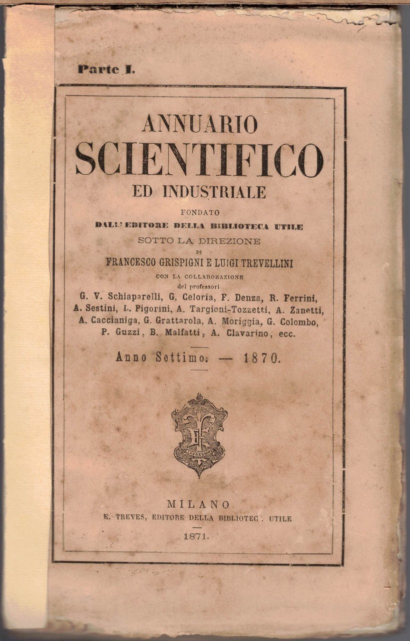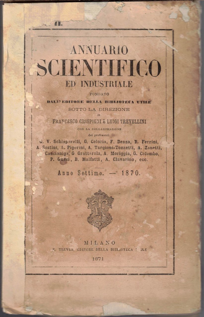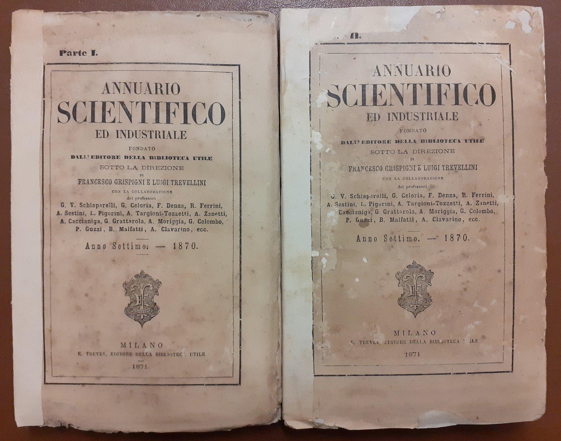 Annuario scientifico ed industriale, fondato dall’Editore della Biblioteca Utile sotto la direzione di Francesco Grispigni e Luigi Trevellini, con la collaborazione di G. V. Schiapparelli et al., anno settimo (VII), 1870, E. Treves, Milano 1971, 2 voll., pp. totali 792, ill. b.n., 1 c. di tav. f.t. ripiegata ill. b.n., cm 19, br. ed. Collana Biblioteca utile, voll. 131-136. Parte prima (voll. 131-133): pp. 384. Parte seconda (voll. 134-136): pp. 385-792. Con la collaborazione di: G. V. Schiaparelli, G. Celoria, F. Denza, R. Ferrini, A. Sestini, L. Pigorini, A. Targioni-Tozzetti, A. Zanetti, A. Caccianiga, G. Grattarola, A. Moriggia, G. Colombo, P. Guzzi, B. Malfatti, A. Clavarino ecc. Evidenti tracce d’uso alle brossure con vecchio rinforzo in carta al dorso di entrambi i volumi, copertina posteriore rifatta in cartoncino al primo volume, alcune mancanze ripristinate da vecchi restauri alla copertina anteriore e posteriore del secondo volume, per il resto minime fioriture, tenue brunitura della carta, ma nel complesso esemplari in buono stato di conservazione, con brossure solide e interno in ben tenuto e di piena fruibilità.