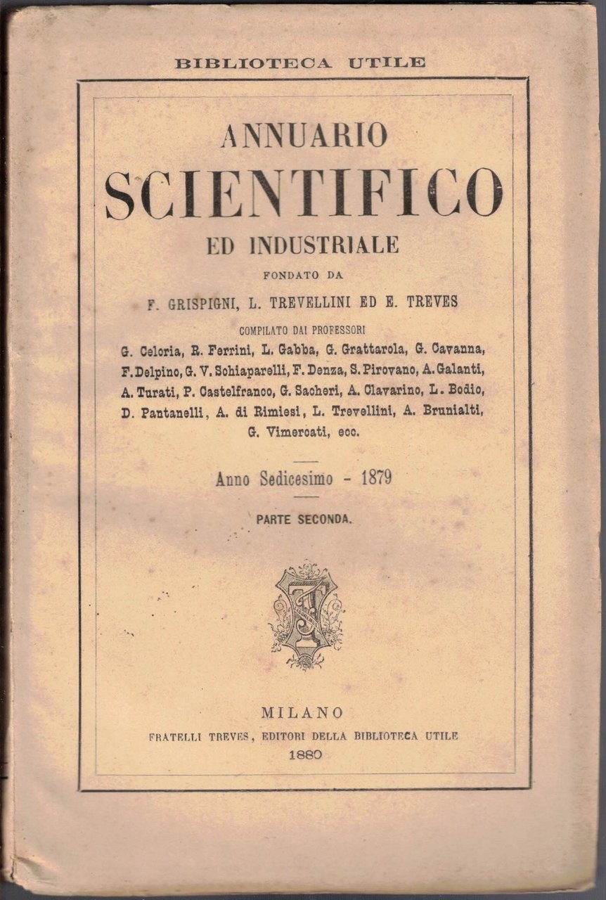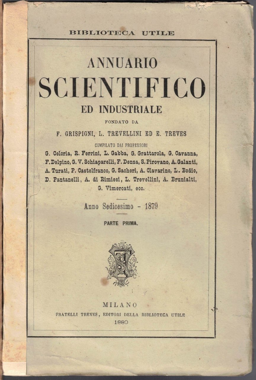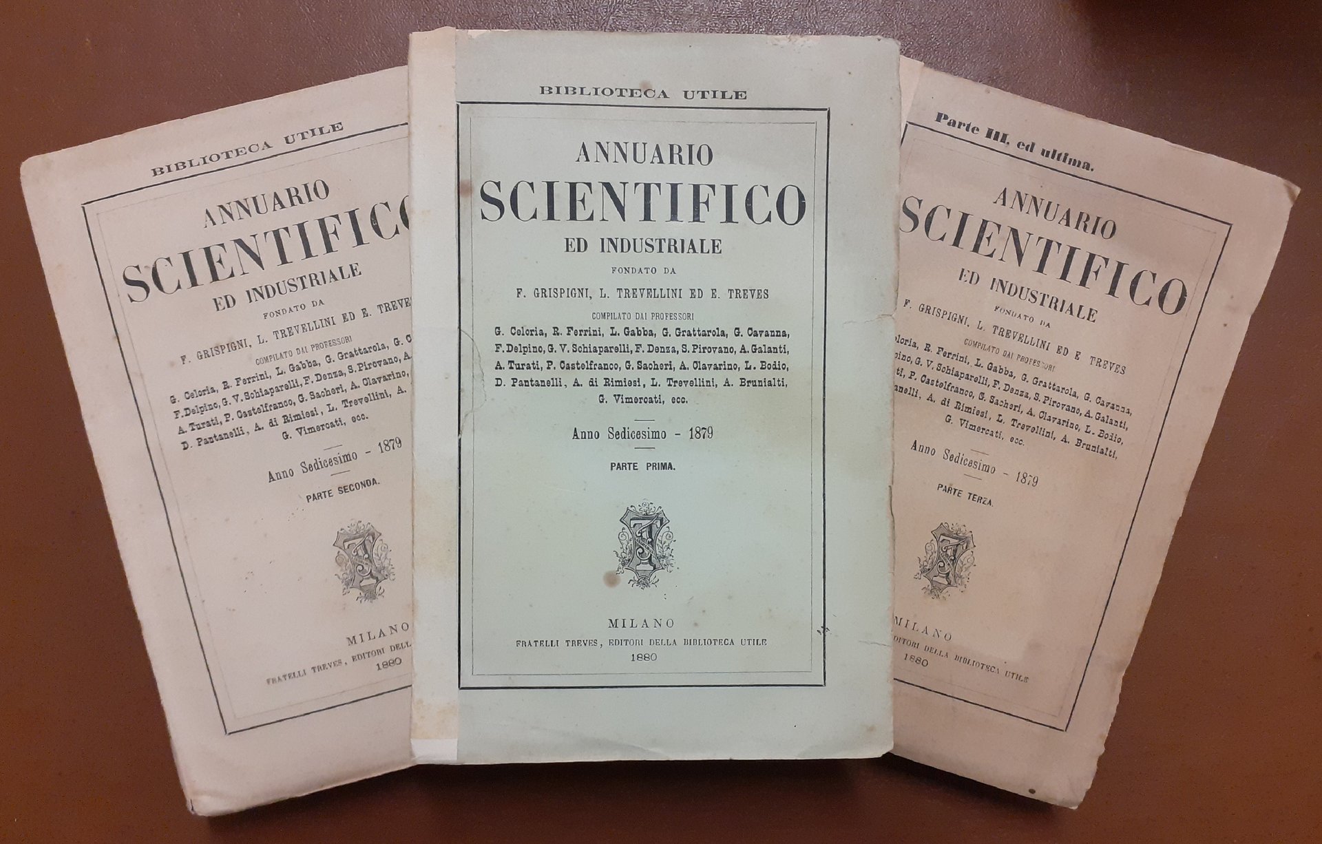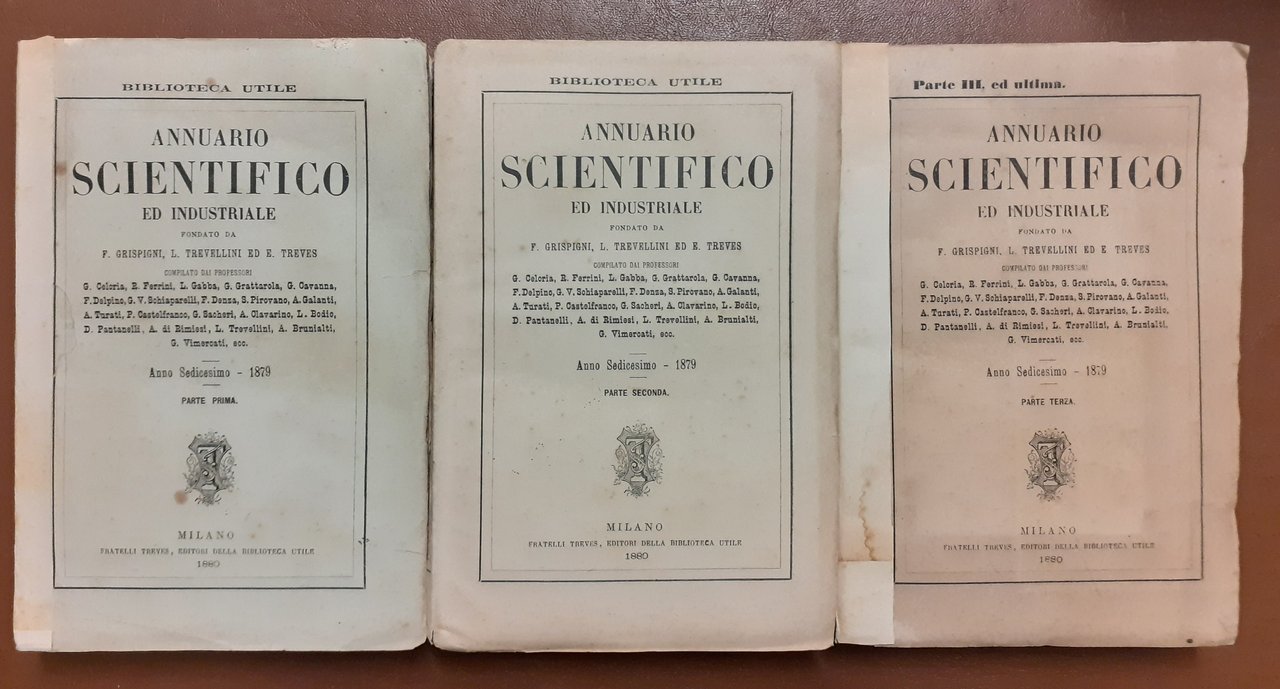 Annuario scientifico ed industriale, fondato da F. Grispigni, L. Trevellini ed E. Treves, compilato dai professori G. Celoria et al., anno sedicesimo (XVI), 1879, Fratelli Treves Editori, Milano 1880, 3 voll. pp. totali 1455, ill. b.n., 1 c. di tav. f.t. ripiegata ill. b.n., cm 19, br. ed. Collana Biblioteca utile, voll. 253-264. Parte prima (voll. 253-256): pp. 480. Parte seconda (voll. 257-260): pp. 481-976. Parte terza (voll. 261-264): pp. 977-1455. Compilato dai professori: G. Celoria, R. Ferrini, L. Gabba, G. Grattarola, G. Cavanna, F. Delpino, G. V. Schiaparelli, F. Denza, S. Pirovano, A. Galanti, A. Turati, P. Castelfranco, G. Sacheri, A. Clavarino, L. Bodio, D. Pantanelli, A. di Rimiesi, L. Trevellini, A. Brunialti, G. Vimercati ecc. Vecchio rinforzo in carta ai dorsi di primo e terzo volume, qualche piccola mancanza al dorso del secondo volume, alcuni strappetti ripristinati da vecchio restauro alla seconda di copertina del primo volume, per il resto minime fioriture, leggera brunitura della carta, ma esemplari ben conservati.