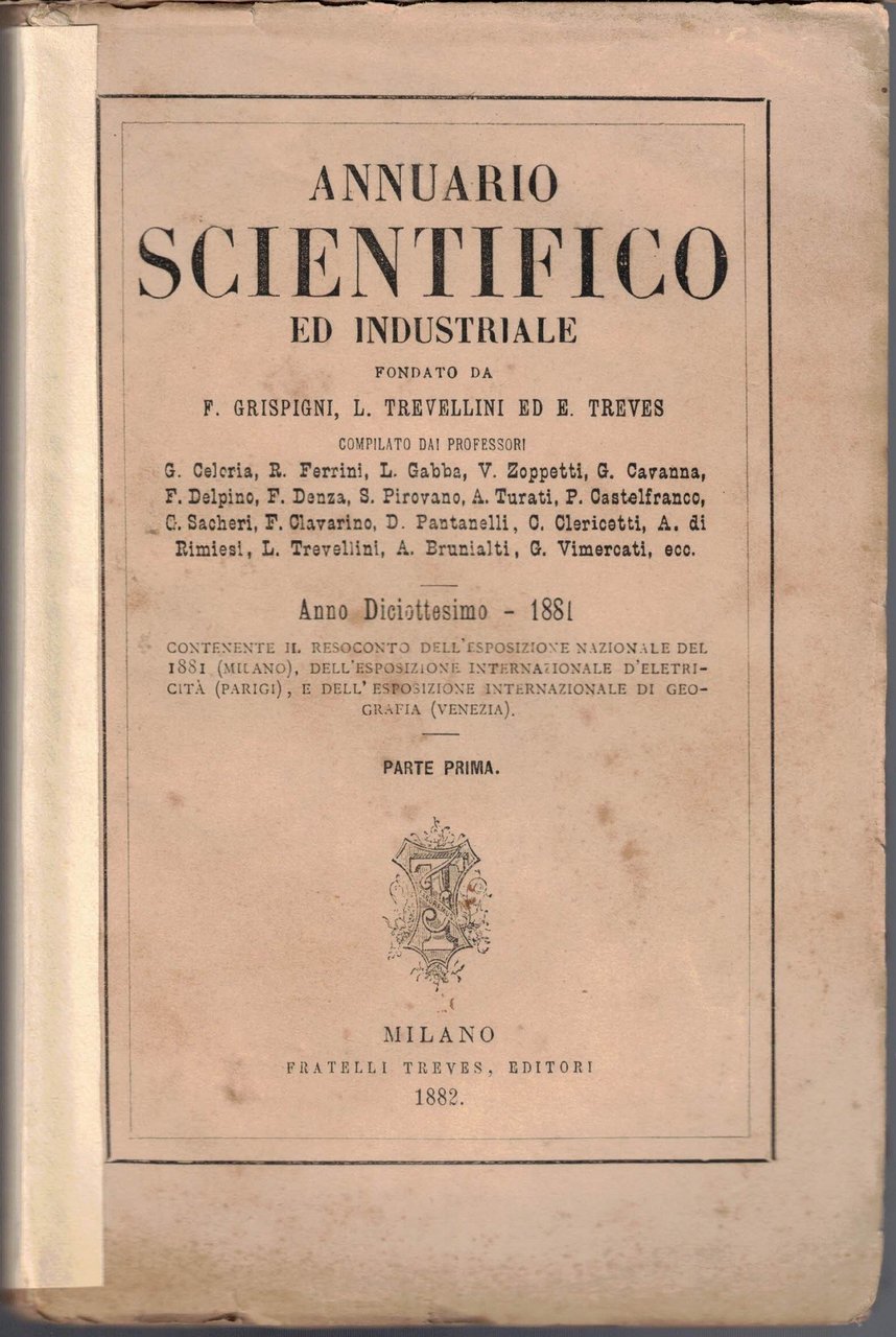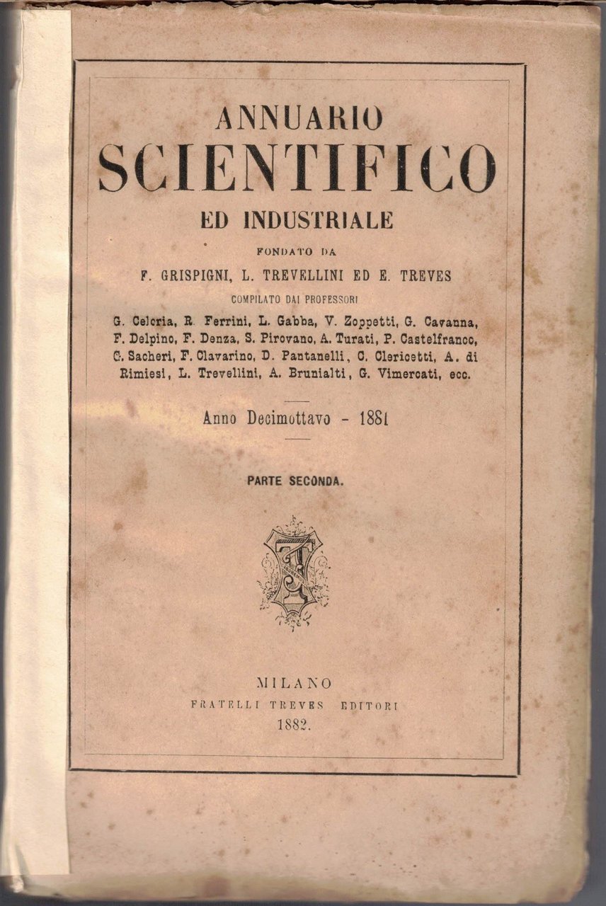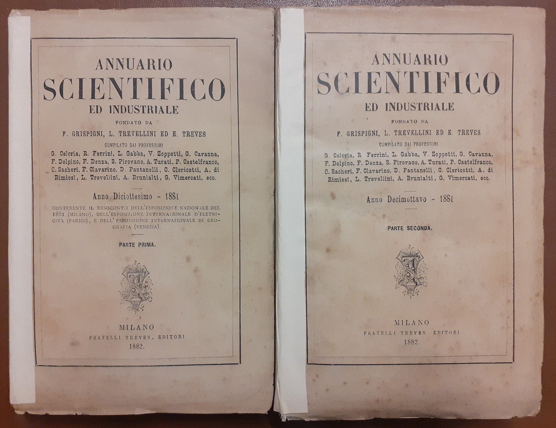 Annuario scientifico ed industriale, fondato da F. Grispigni, L. Trevellini ed E. Treves, compilato dai professori G. Celoria et al., anno diciottesimo (XVIII), 1881, parti I e II, Fratelli Treves Editori, Milano 1882, 2 voll., pp. totali 1091, ill. b.n., 2 c. di tavv. f.t. ripiegate ill. b.n., cm 19, br. ed. Compilato dai professori: G. Celoria, R. Ferrini, L. Gabba, V. Zoppetti, G. Cavanna, F. Delpino, F. Denza, S. Pirovano, A. Turati, P. Castelfranco, G. Sacheri, F. Ciavarino, D. Pantanelli, A. di Rimiesi, L. Trevellini, A. Brunialti, G. Vimercati ecc. Parte prima: pp. 480. Parte seconda: pp. 481-1091. Vecchio rinforzo in carta al dorso di entrambi i volumi, minime fioriture, tenue brunitura della carta, per il resto esemplari ben conservati.