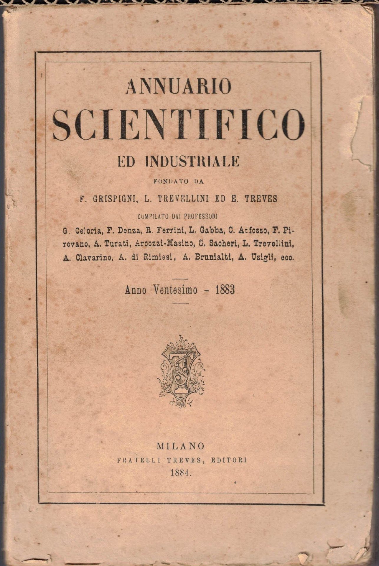 Annuario scientifico ed industriale, fondato da F. Grispigni, L. Trevellini ed E. Treves, compilato dai professori G. Celoria et al., anno ventesimo (XX), 1883, Fratelli Treves Editori, Milano 1884, pp. 638, (10), ill. b.n., cm 19, br. ed. Compilato dai professori: G. Celoria, F. Denza, R. Ferrini, L. Gabba, C. Anfosso, F. Pirovano, A. Turati, Arcozzi-Masino, G. Sacheri, L. Trevellini, A. Clavarino, A. di Rimiesi, A. Brunialti, G. Vimercati ecc. Piccolo timbro d’appartenenza all’occhiello. Alcune piccole mancanze a margine della copertina anteriore e al piede del dorso, minime fioriture, tenue brunitura della carta, per il resto buon esemplare.