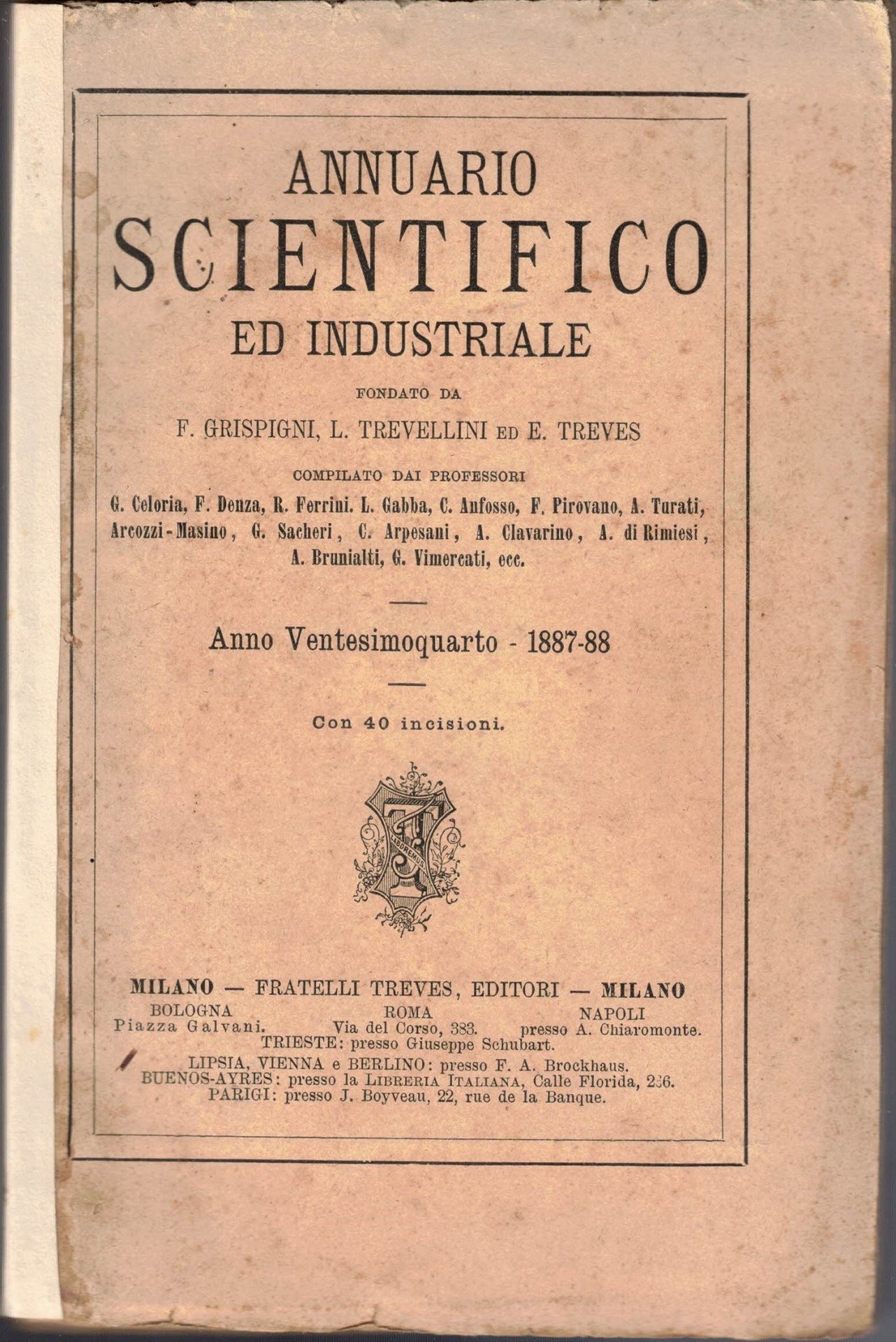 Annuario scientifico ed industriale, fondato da F. Grispigni, L. Trevellini ed E. Treves, compilato dai professori G. Celoria et al., anno ventesimoquarto (XXIV), 1887-88, Fratelli Treves Editori, Milano 1888, pp. 626, ill. b.n., cm 19, br. ed. Compilato dai professori: G. Celoria, F. Denza, R. Ferrini, L. Gabba, C. Anfosso, F. Pirovano, A. Turati, Arcozzi-Masino, G. Sacheri, C. Arpesani, A. Clavarino, A. di Rimiesi, A. Brunialti, G. Vimercati ecc. Vecchio rinforzo in carta al dorso, una piccola mancanza a margine della copertina posteriore, minime fioriture, tenue brunitura della carta, per il resto esemplare ben conservato.