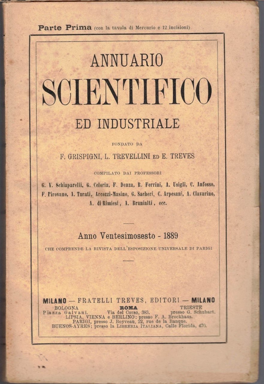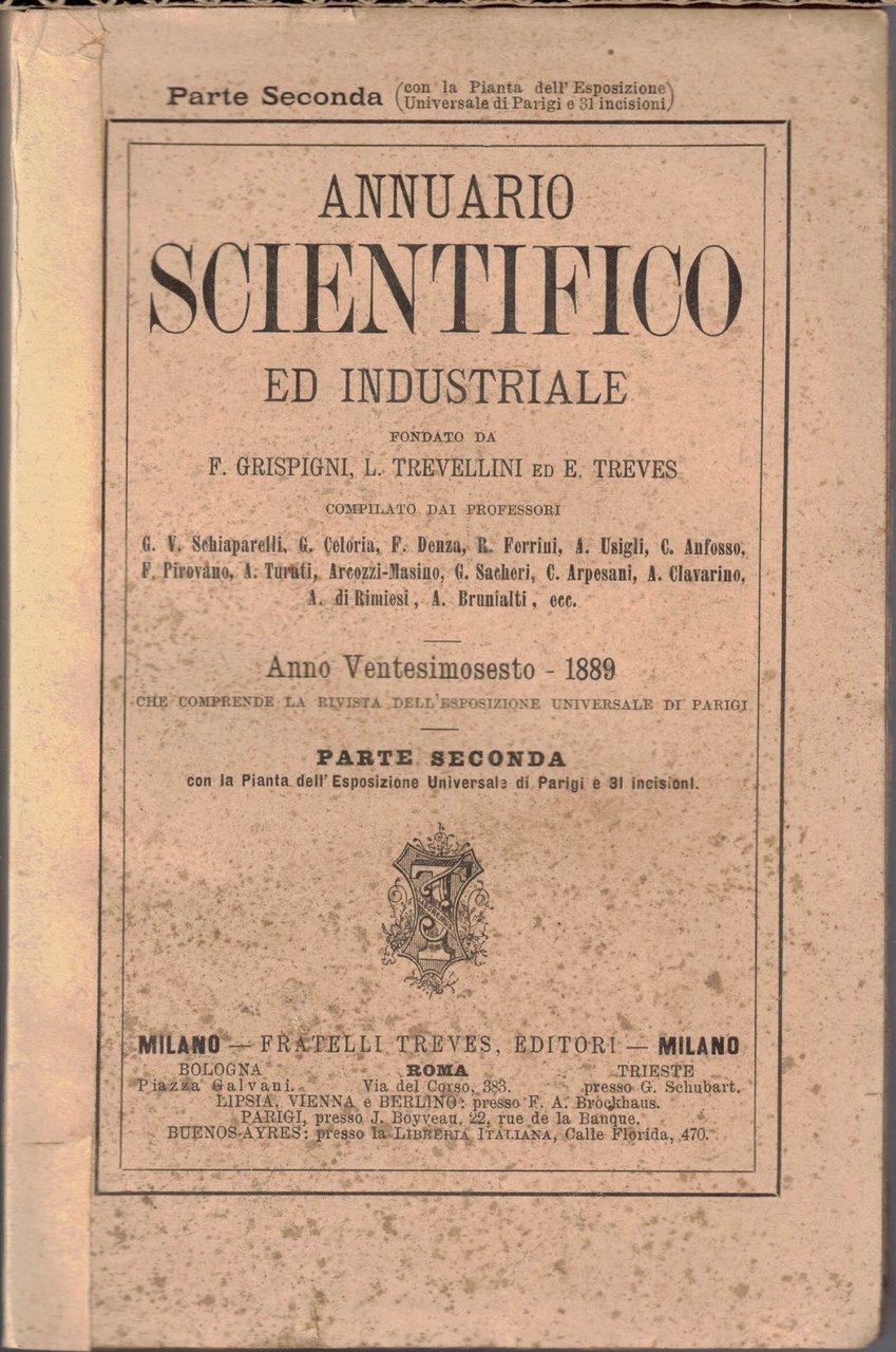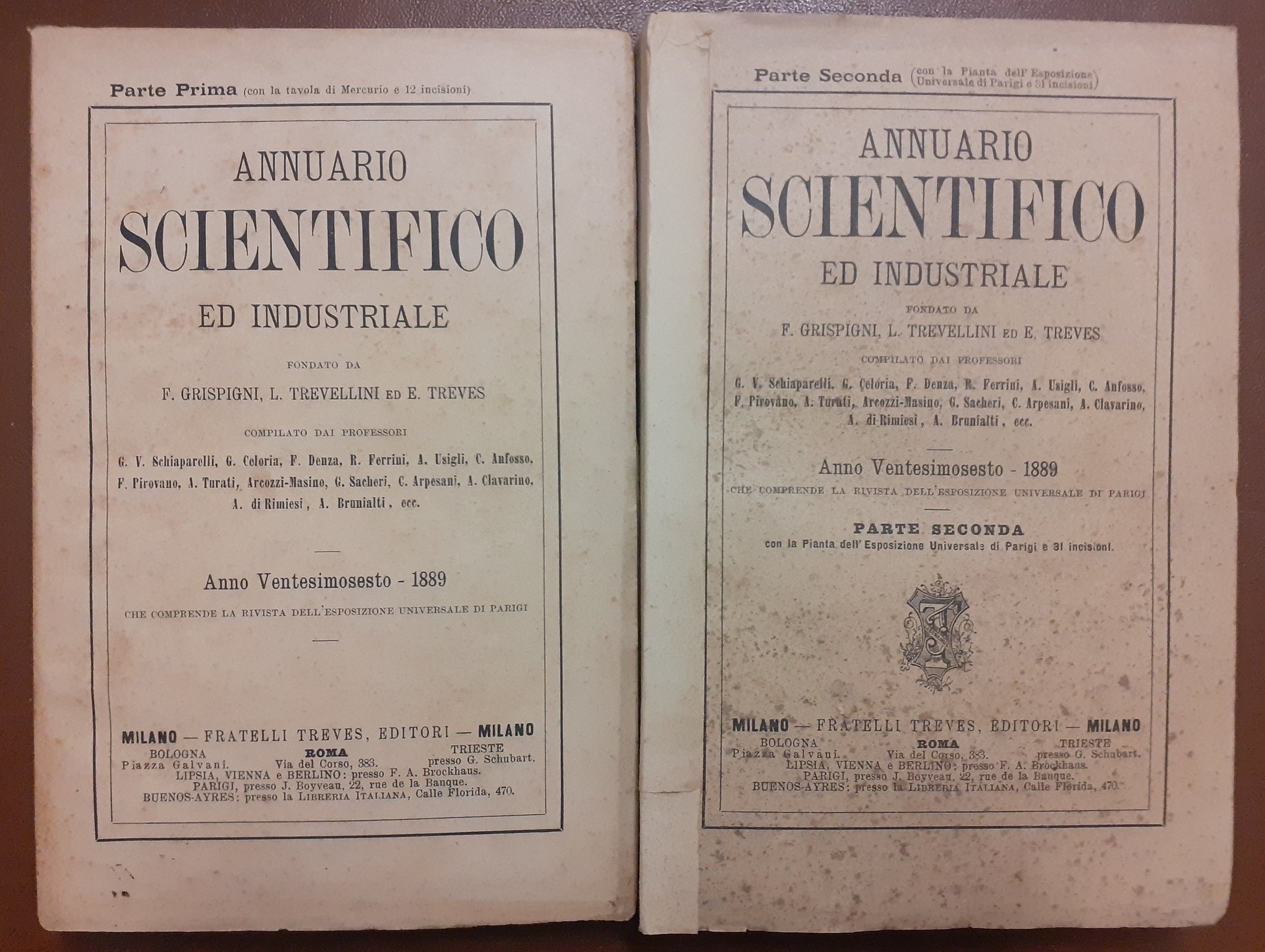 Annuario scientifico ed industriale, fondato da F. Grispigni, L. Trevellini ed E. Treves, compilato dai professori G. V. Schiaparelli et al., anno ventesimosesto (XXVI), 1889, Fratelli Treves Editori, Milano 1890, 2 voll., pp. totali 825, ill. b.n., 2 c. di tavv. f.t. ill. b.n. di cui una ripiegata, cm 19, br. ed. Compilato dai professori: G. V. Schiaparelli, G. Celoria, F. Denza, A. Usigli, C. Anfosso, F. Pirovano, A. Turati, Arcozzi-Masino, G. Sacheri, C. Arpesani, A. Clavarino, A. di Rimiesi, A. Brunialti ecc. Parte prima: pp. 336. Parte seconda: pp. 337-826. All’interno del secondo volume tavola ripiegata ill. b.n. con pianta dell’Esposizione Universale di Parigi. Vecchio rinforzo in carta al dorso del secondo volume, minime fioriture, tenue brunitura della carta, per il resto esemplari ben conservati.