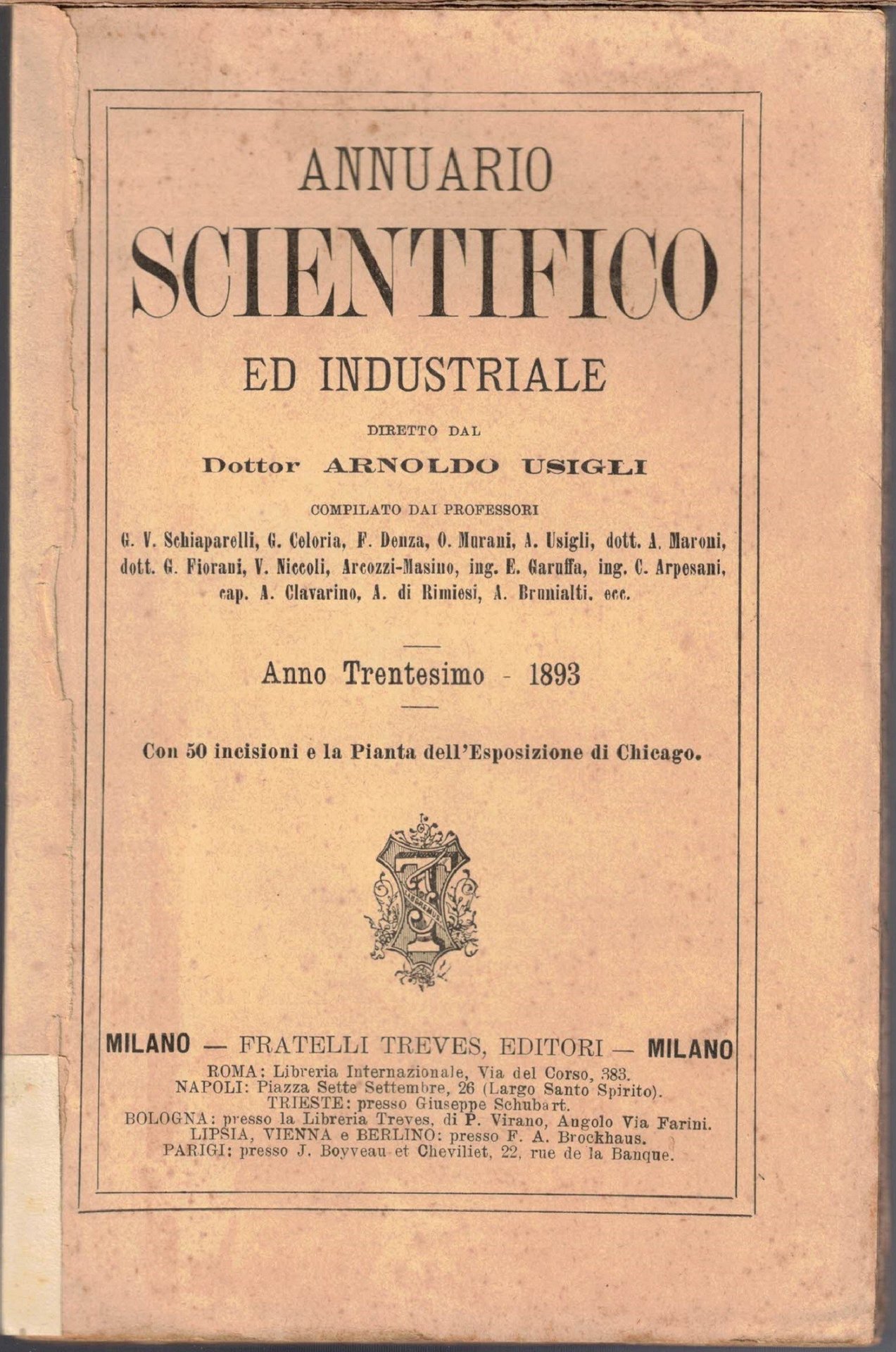 Annuario scientifico ed industriale, diretto da Arnoldo Usigli, compilato dai professori G. V. Schiaparelli et al., anno trentesimo (XXX), 1893, Fratelli Treves Editori, Milano 1894, pp. 542, ill. b.n., 1 c. di tavv. f.t. ripiegata ill. b.n. con pianta dell’Esposizione di Chicago., cm 19, br. ed. Compilato dai professori: G. V. Schiaparelli, G. Celoria, F. Denza, O. Murani, A. Usigli, A. Maroni, G. Fiorani, V. Niccoli, Arcozzi-Masino, E. Garuffa, C. Arpesani, A. Clavarino, A. di Rimiesi A. Brunialti ecc. Vecchio rinforzo in carta al dorso, minime fioriture, tenue brunitura della carta, per il resto esemplare ben conservato.