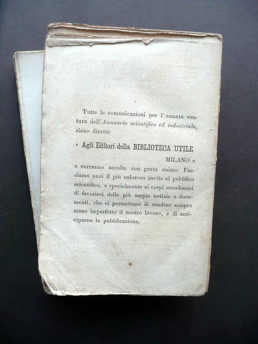 Annuario Scientifico ed Industriale Lessona Anno I Biblioteca Utile Milano 1865