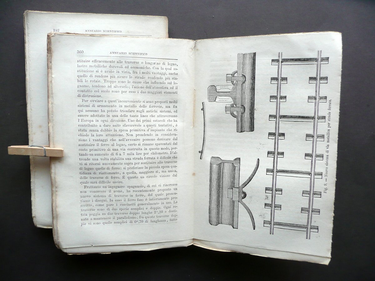 Annuario Scientifico ed industriale Rivista annuale delle scienze di osservazione e delle loro applicazioni in Italia ed all'Estero Con esposizione dei lavori nazionali di statistica e storia patria Compilata da Francesco Grispigni e Luigi Trevellini Con prefazione del Prof. Michele Lessona Anno primo Presso gli editori della Biblioteca Utile, Milano 1865, cm 19x12,5, pp. 572 con qualche fig. in b/n nel t. e fuori t. (qualcuna su due pagine); mancanza della brossura post. Condizioni di conservazione Esemplare in modeste condizioni con tracce d'uso e del tempo; mancanza della brossura post.; dorso fessurato con conseguente sfascicolazione dell'esemplare in due metà (vedi foto); cuciture dell'ultimo fascicolo allentate; brossura ant. con alcuni piccoli strappetti e minimi accenni di sporco; margine sup. con leggerissime tracce di vecchia annotazione a matita; cuffie con piccole mancanze. Interni con qualche lieve brunitura; angoli di qualche pagina con una piccola pieghetta / traccia di pieghetta. SETT126.L12293 N
